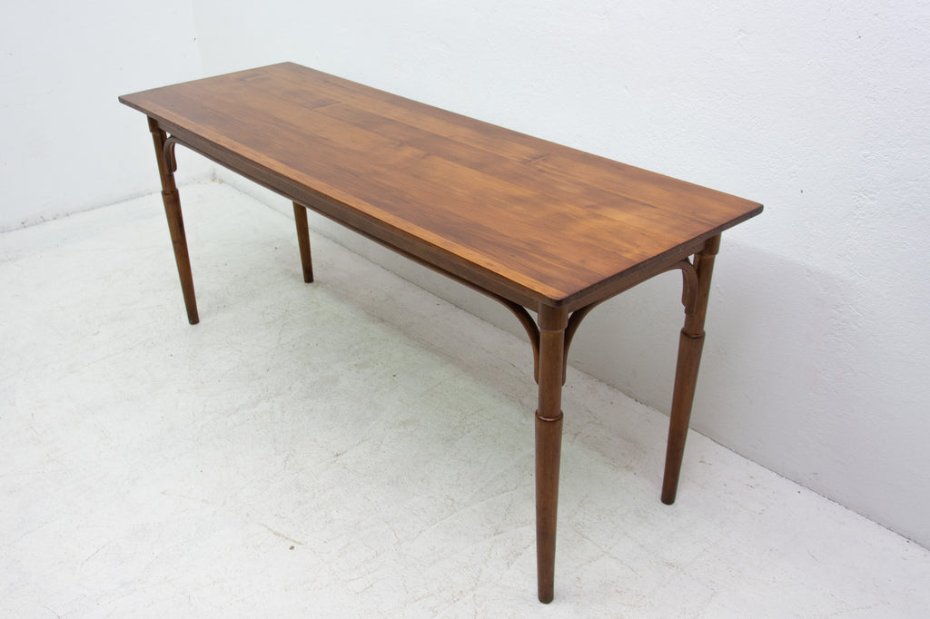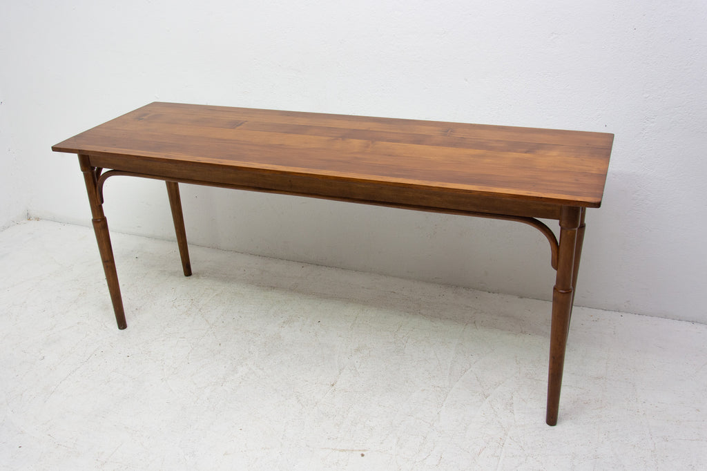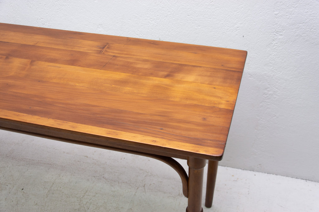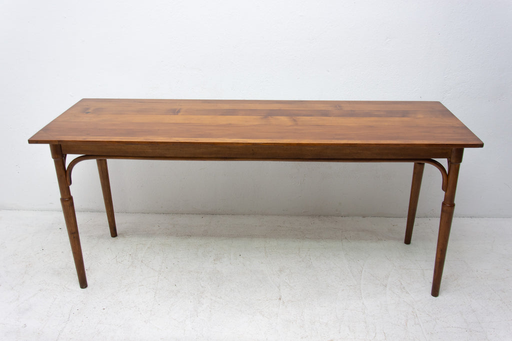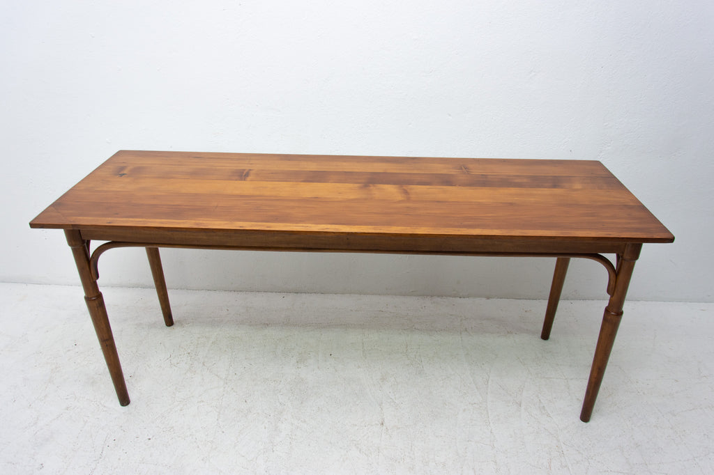 This long occasional coffee table was probably made in the early 20th century in the Austria-Hungary territory. No marks or stamp. But we attribute to Thonet or Fischel company. Made of a combination of beech and larch wood. Fully restored. In excellent condition. It can also be used as a dinning table. Lenght is 180 cm.