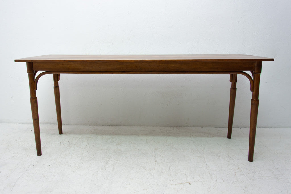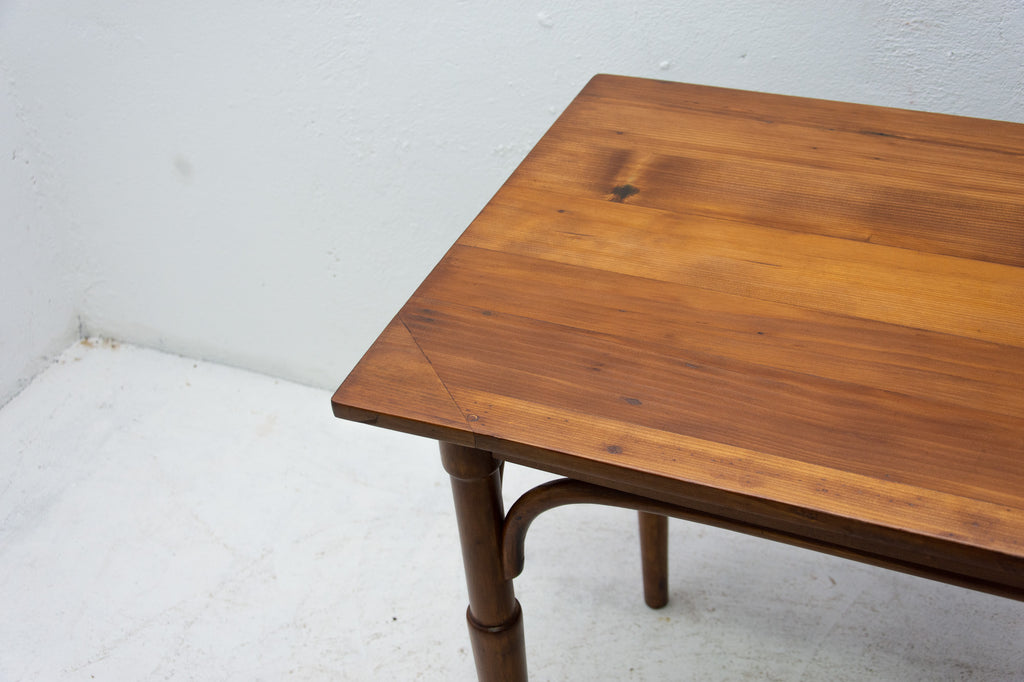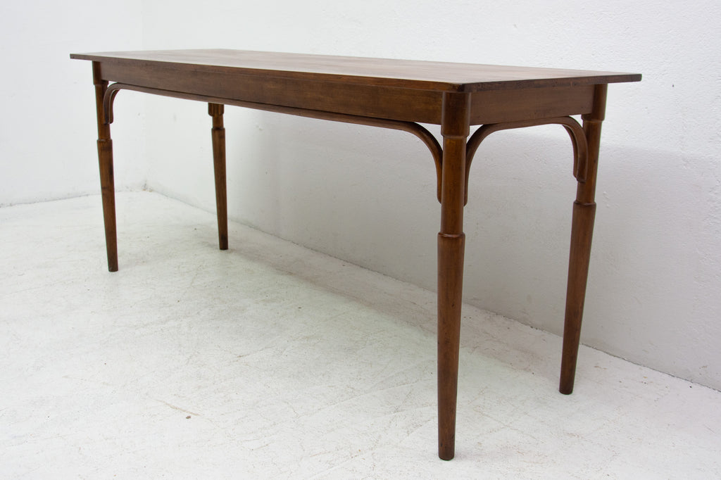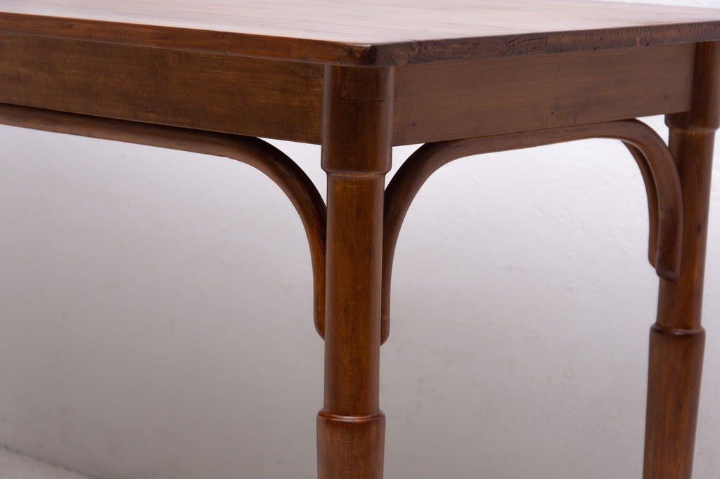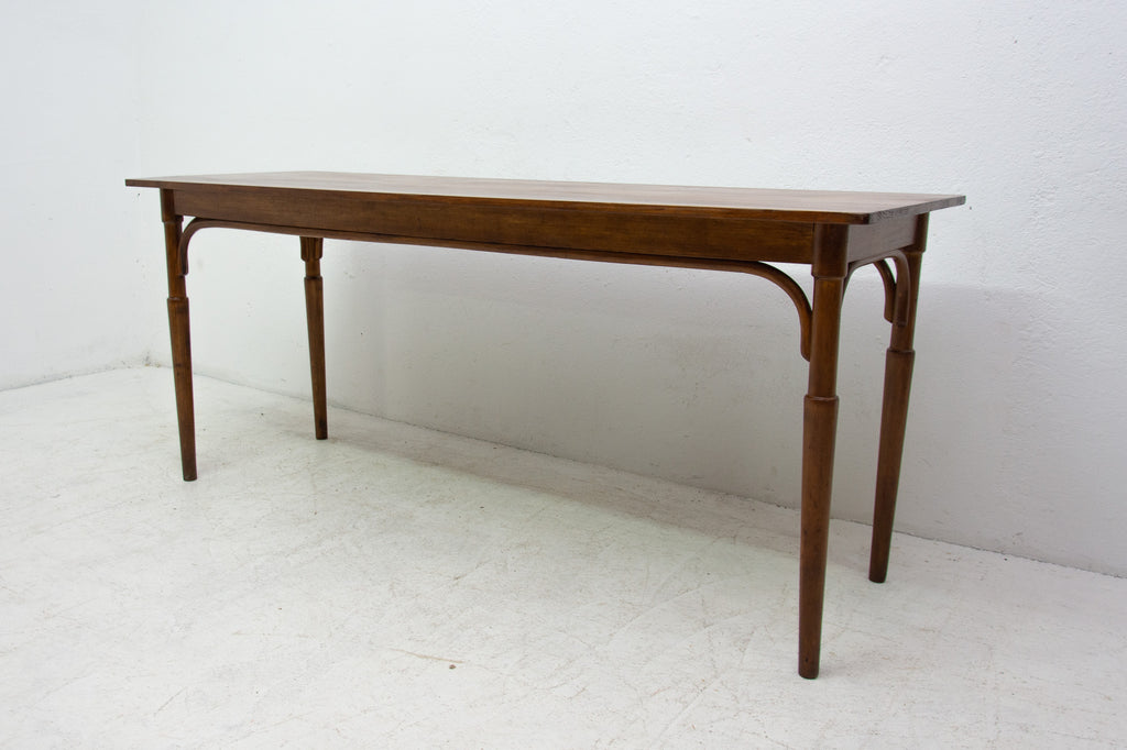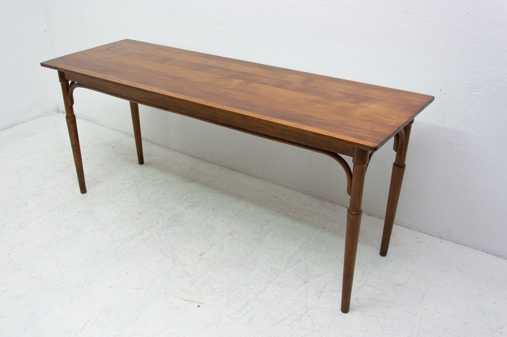 This long occasional coffee table was probably made in the early 20th century in the Austria-Hungary territory. No marks or stamp. But we attribute to Thonet or Fischel company. Made of a combination of beech and larch wood. Fully restored. In excellent condition. It can also be used as a dinning table. Lenght is 180 cm.