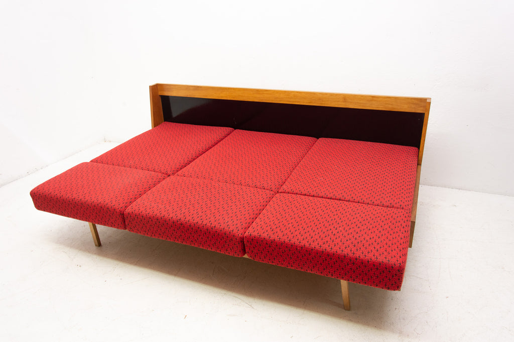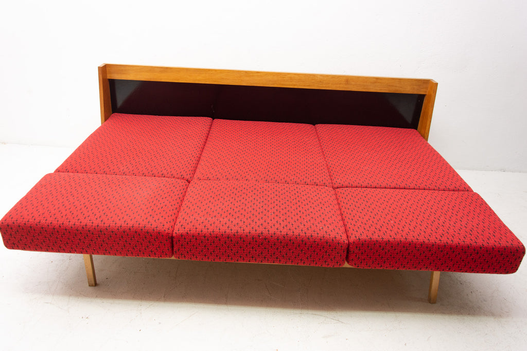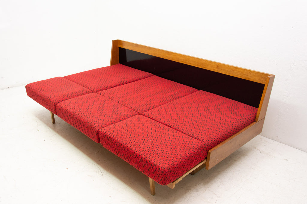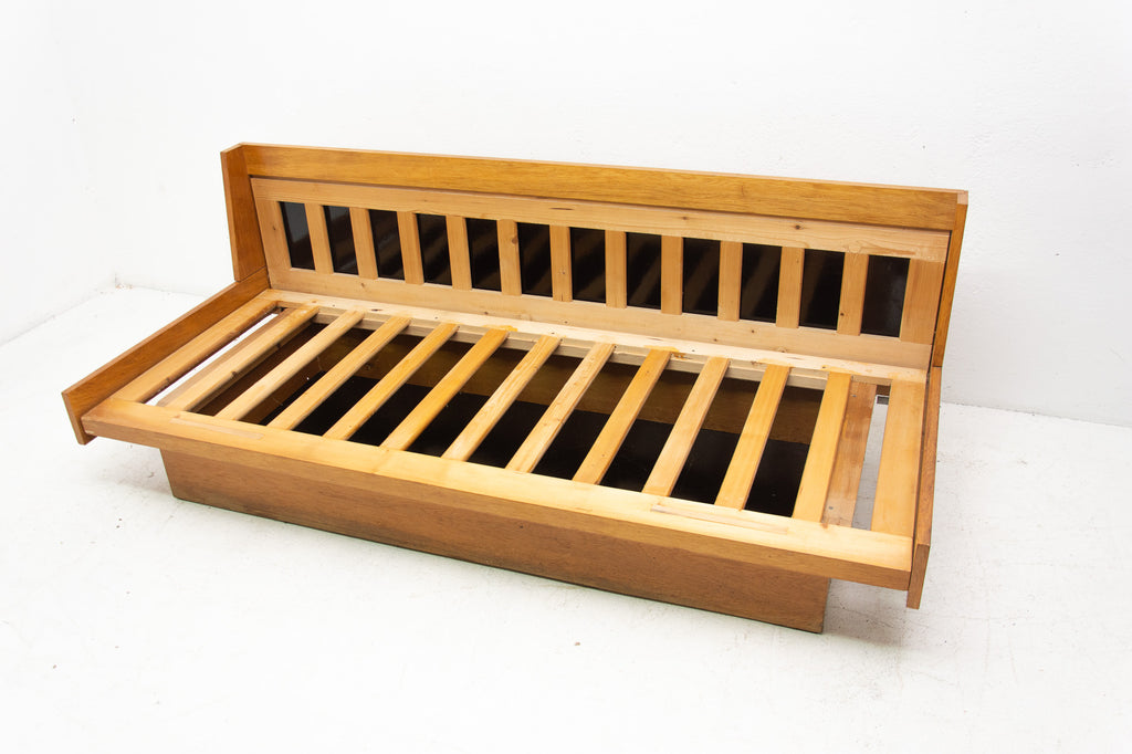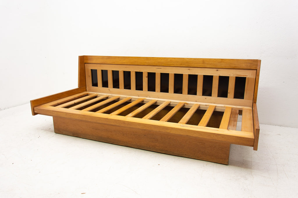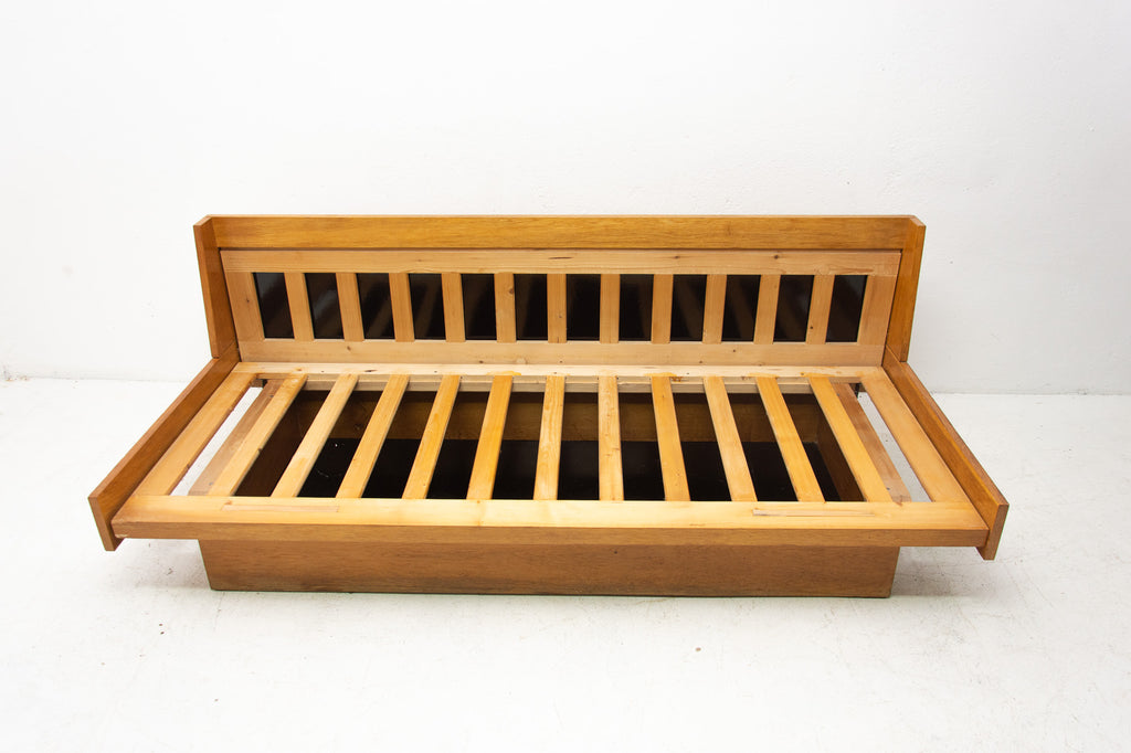Mid century sofabed,made in the former Czechoslovakia in the 1960´s. This sofa features a wooden structure that is veneered in oak and walnut. The sofa is in very good original condition, marks signs of age and using.