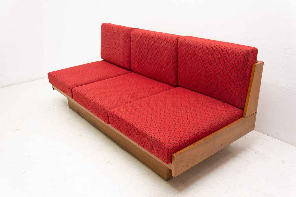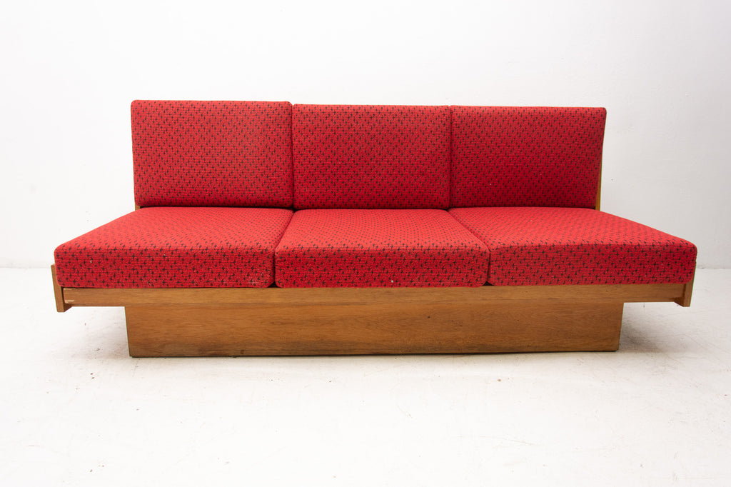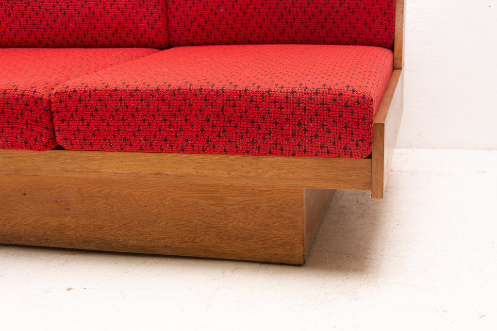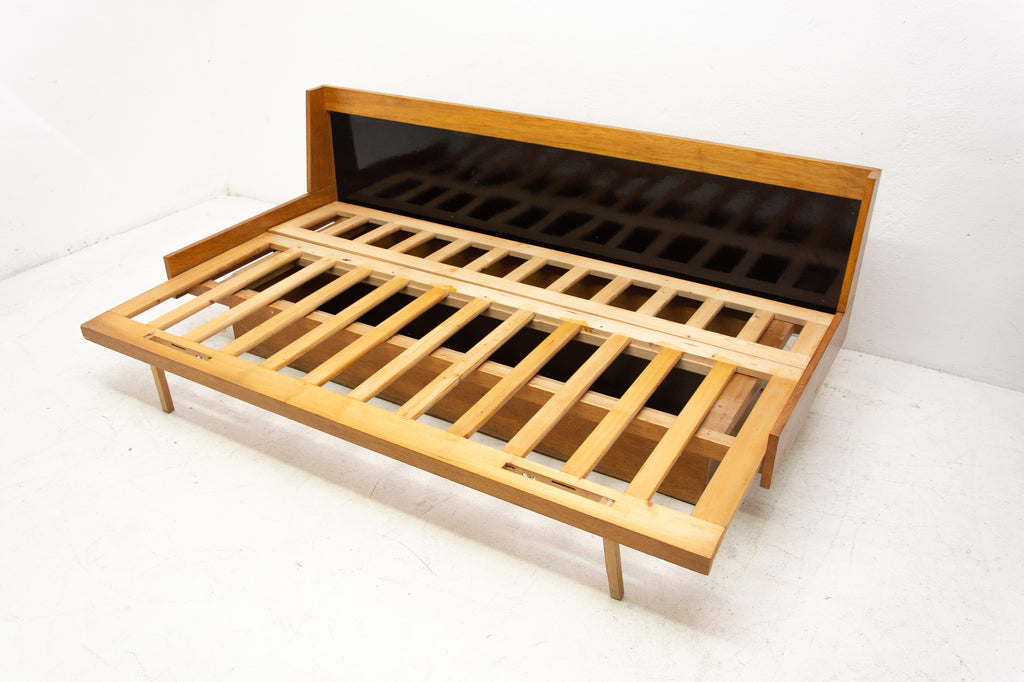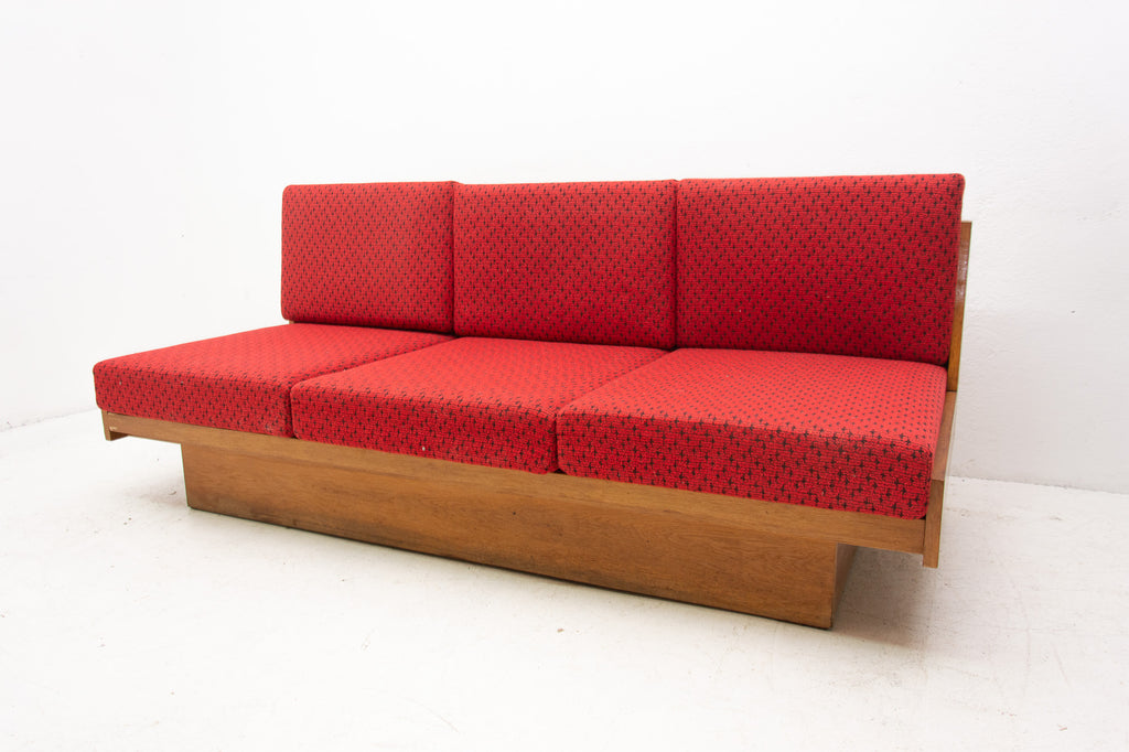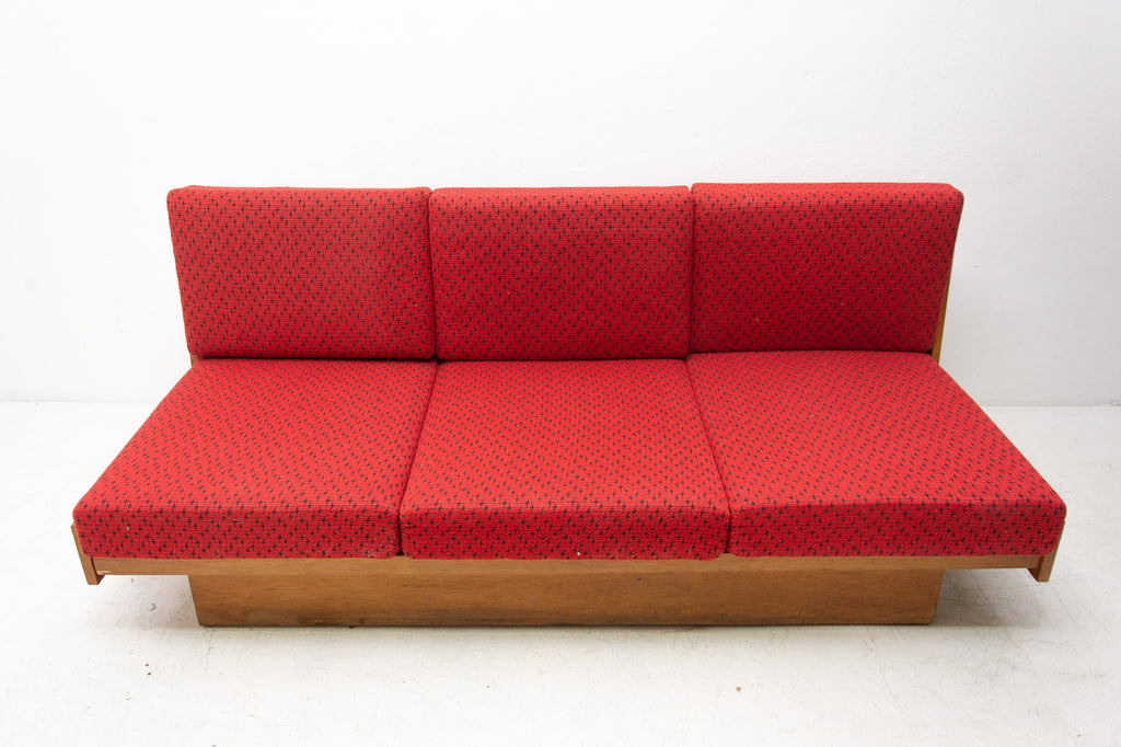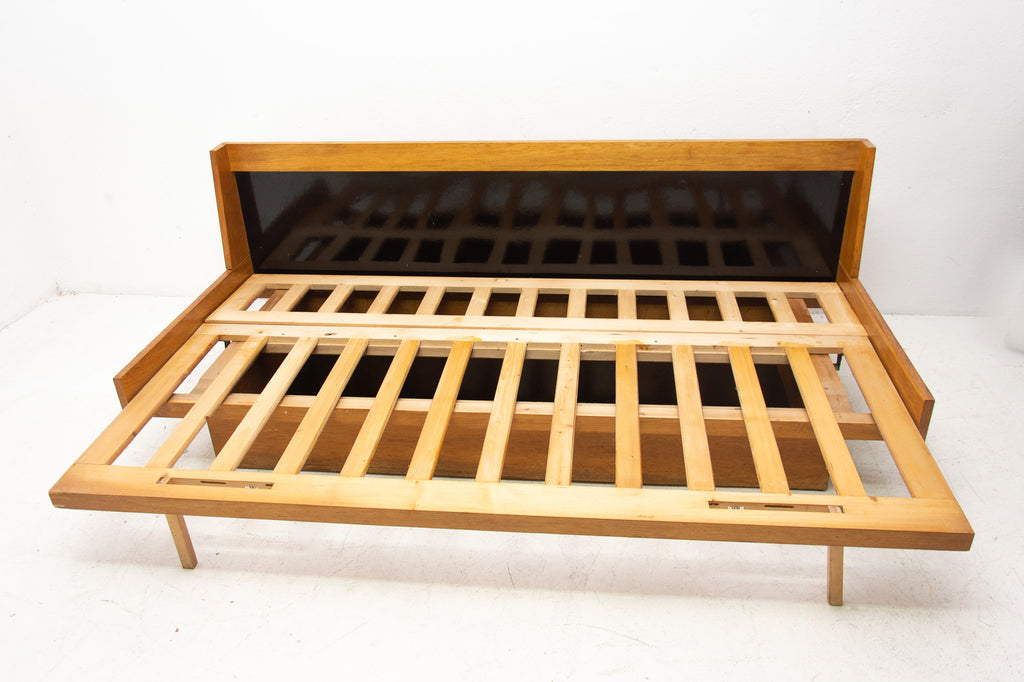 Mid century sofabed,made in the former Czechoslovakia in the 1960´s. This sofa features a wooden structure that is veneered in oak and walnut. The sofa is in very good original condition, marks signs of age and using.