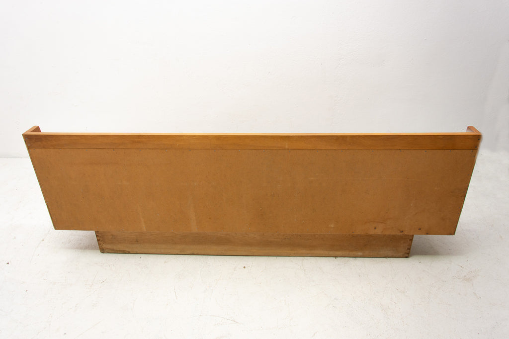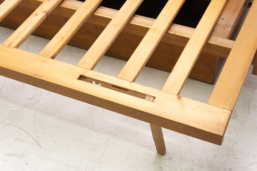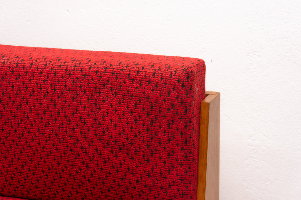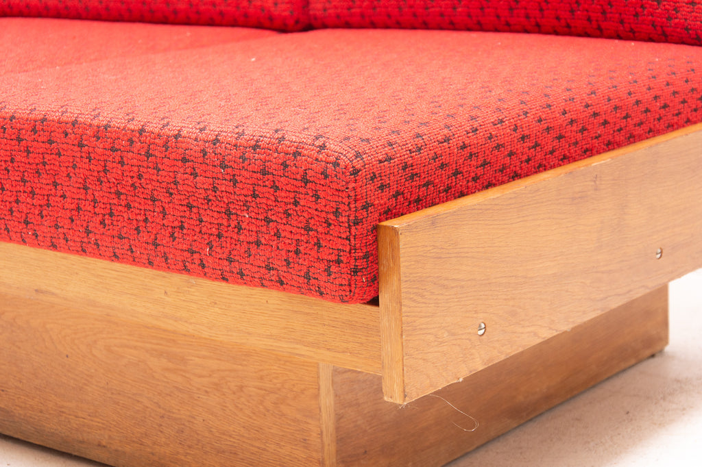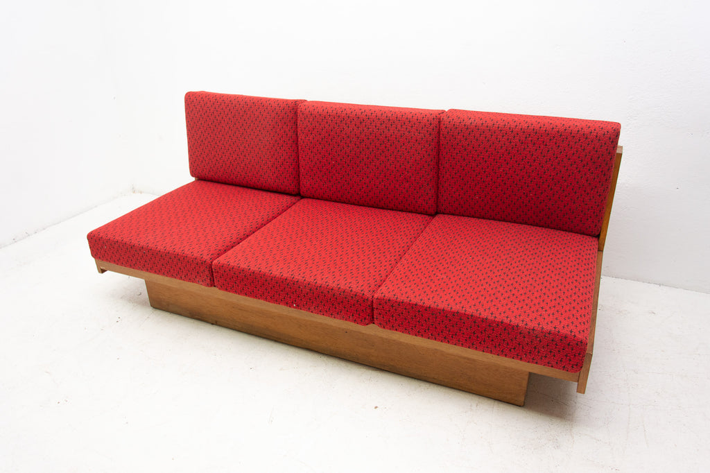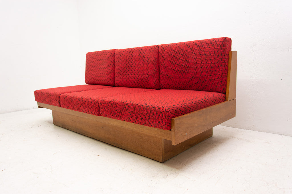 Mid century sofabed,made in the former Czechoslovakia in the 1960´s. This sofa features a wooden structure that is veneered in oak and walnut. The sofa is in very good original condition, marks signs of age and using.