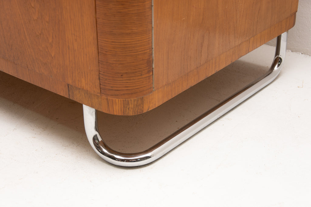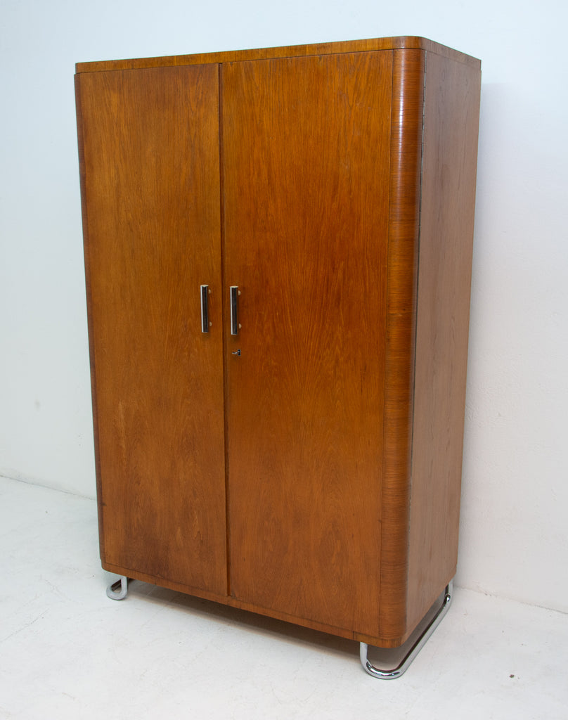 This is a typical example of residential furniture from the Bauhaus period in Central Europe. Chrome is in very good condition. The cabinet is made of oak wood. It is in very good condition without any damage. The wardrobe is ready to use immediately.