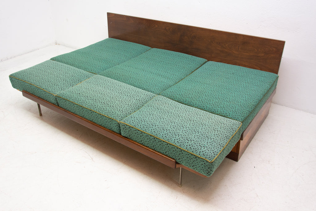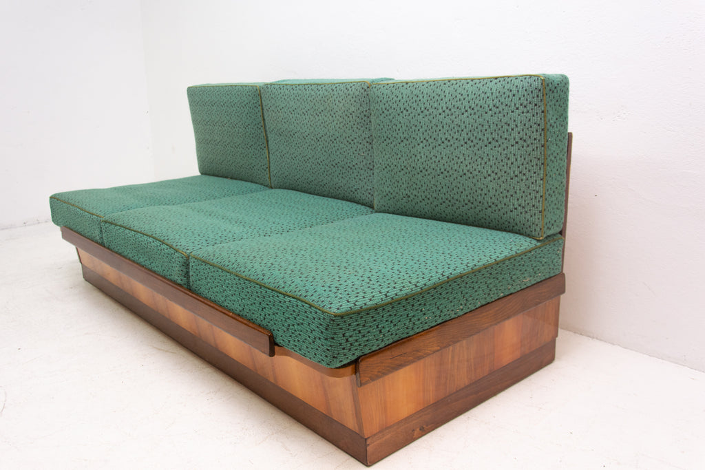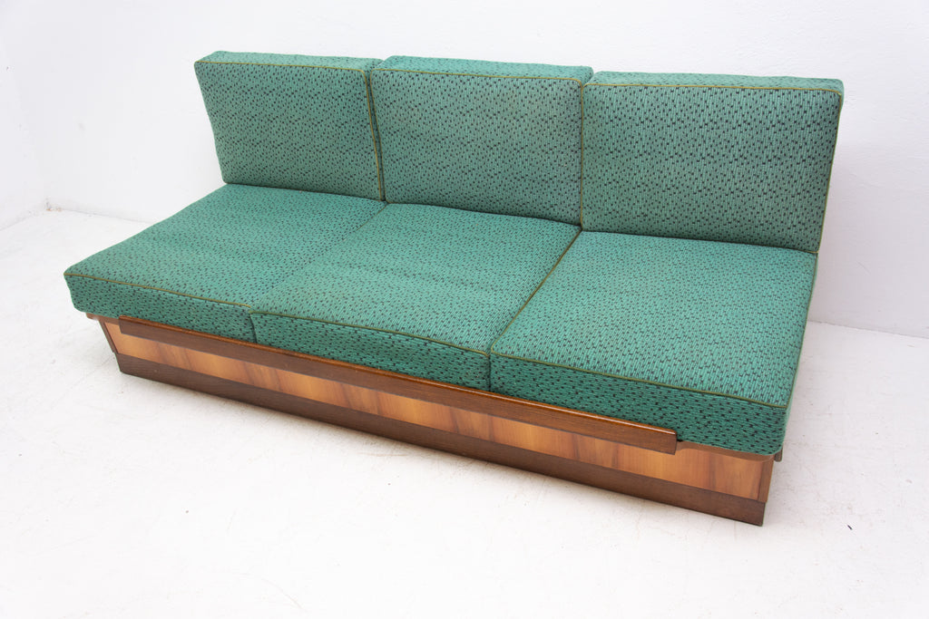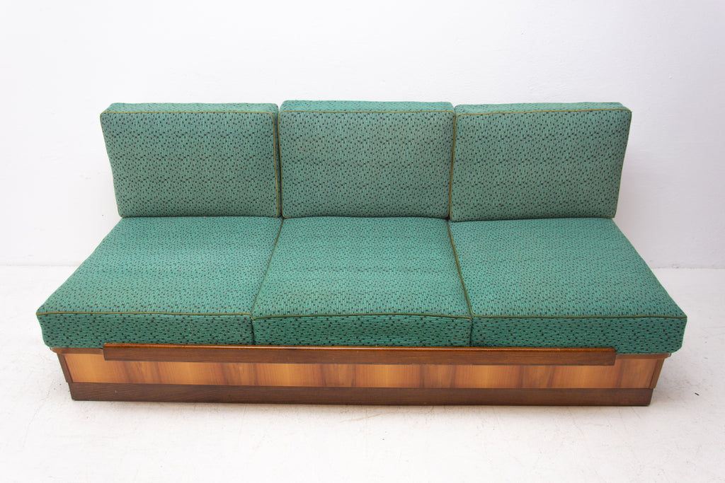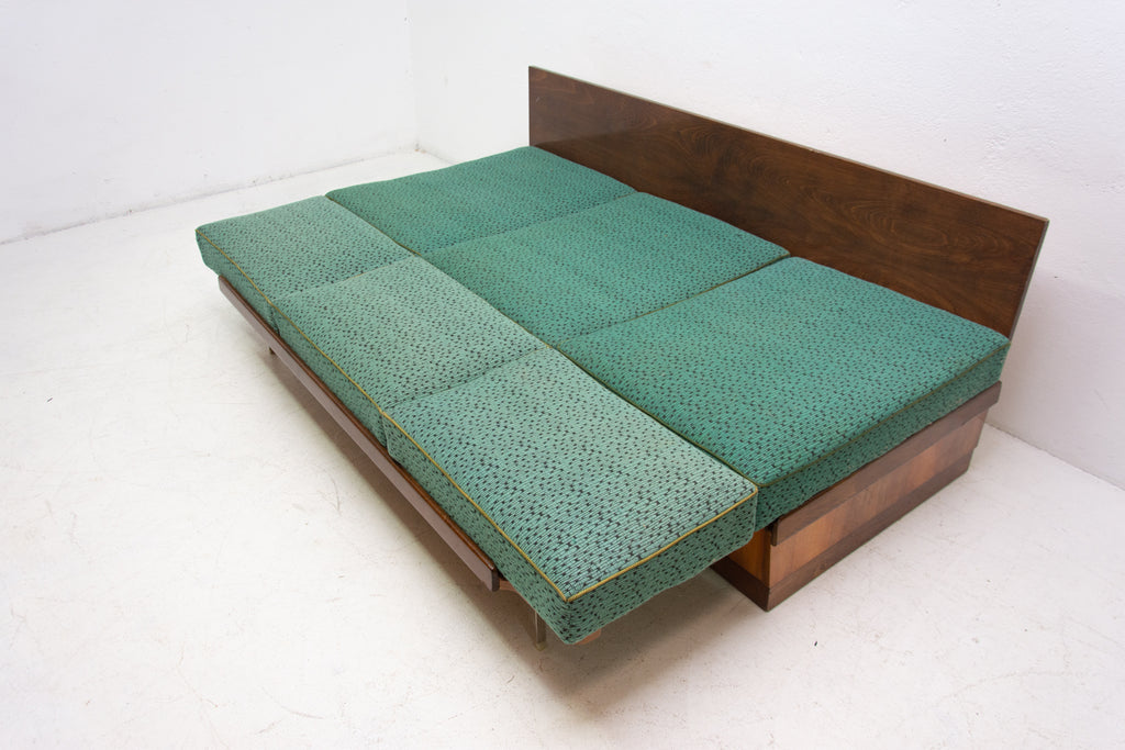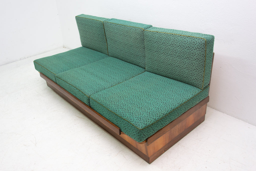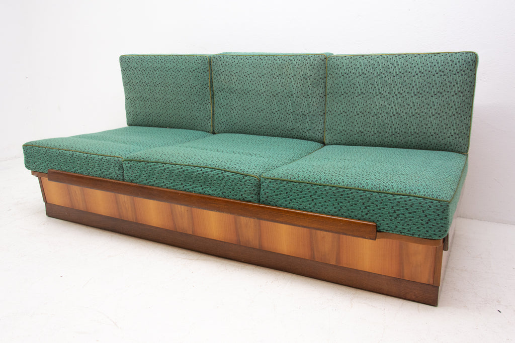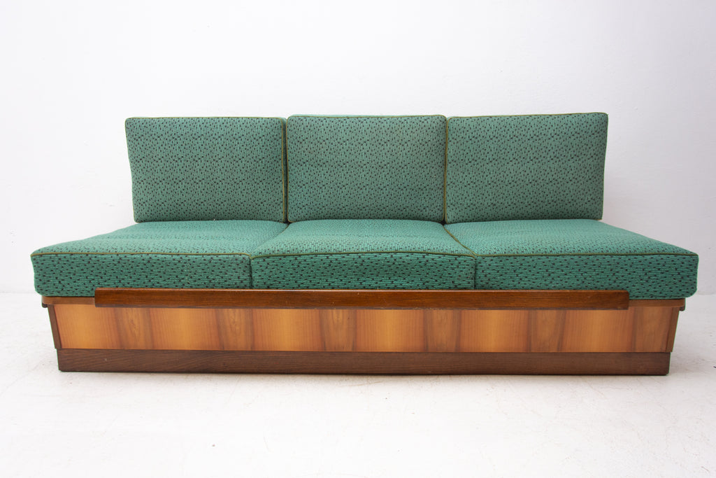 Mid century sofabed designed by Jindřich Halabala. It was made in the former Czechoslovakia in the 1950´s. This sofa features a wooden structure that is veneered in the walnut and a storage space for bedding. Sofa is adjustable for sleeping. The sofa is in very good Vintage condition, shows slight signs of age and using.