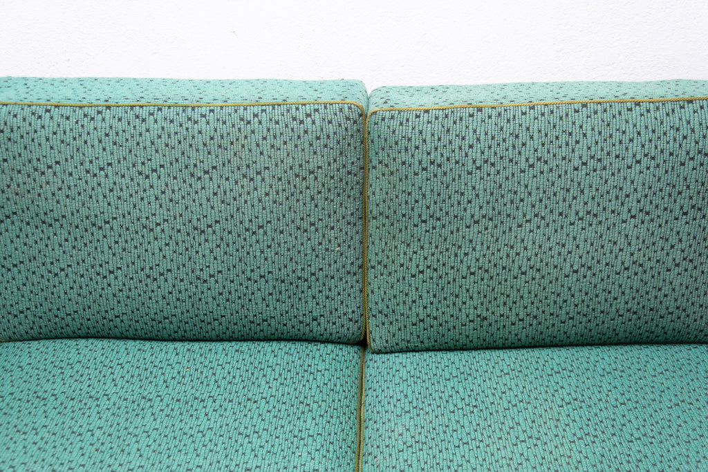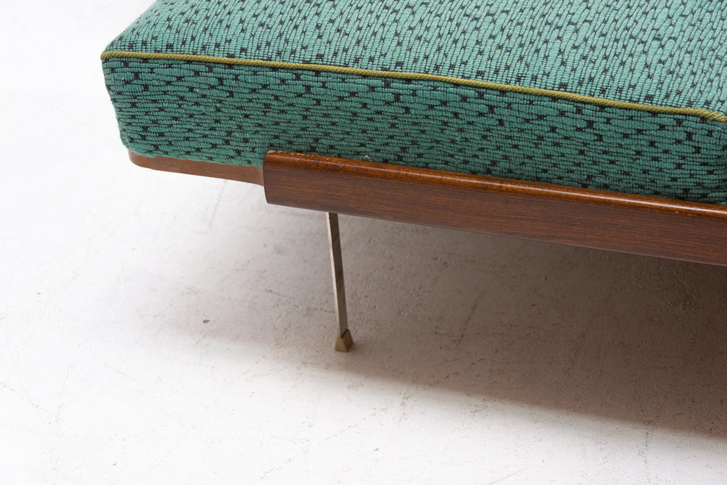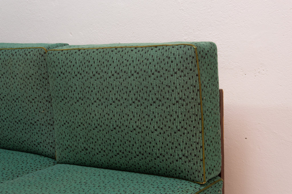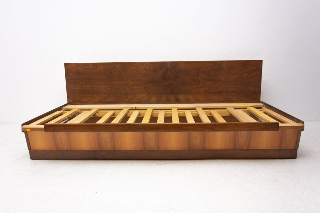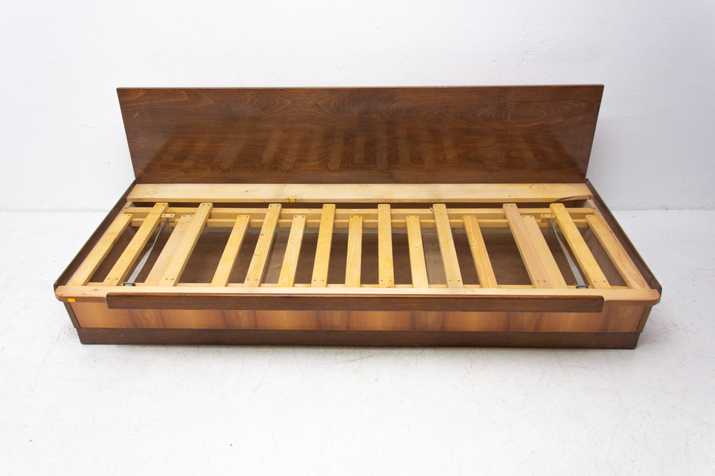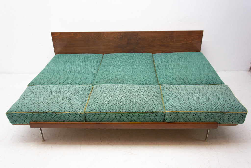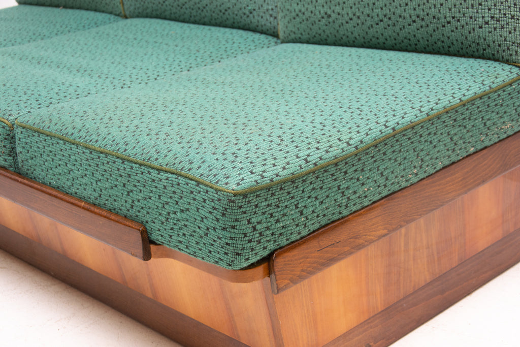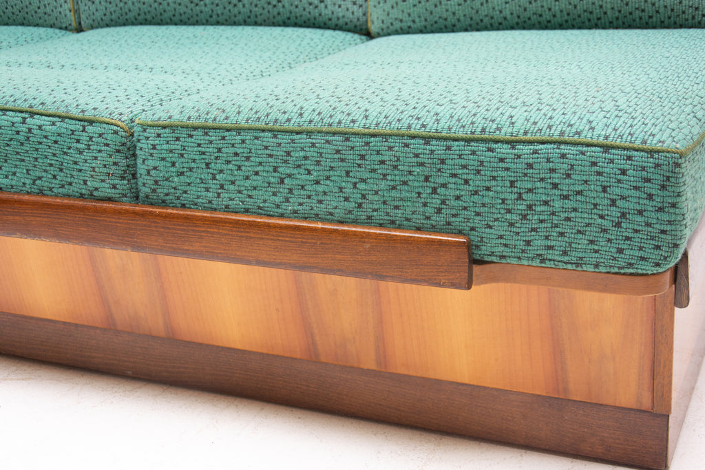 Mid century sofabed designed by Jindřich Halabala. It was made in the former Czechoslovakia in the 1950´s. This sofa features a wooden structure that is veneered in the walnut and a storage space for bedding. Sofa is adjustable for sleeping. The sofa is in very good Vintage condition, shows slight signs of age and using.