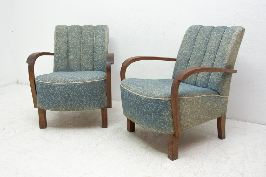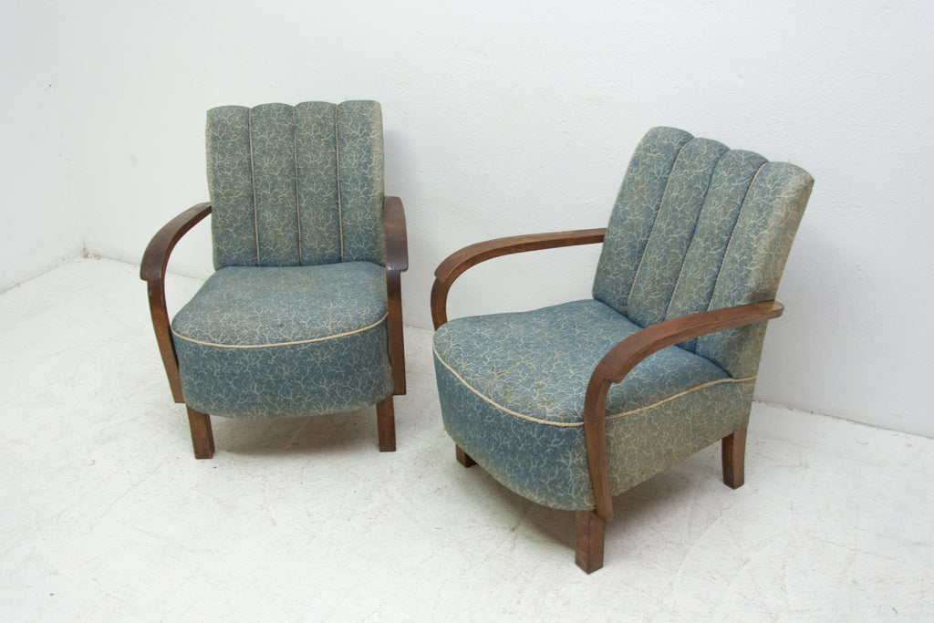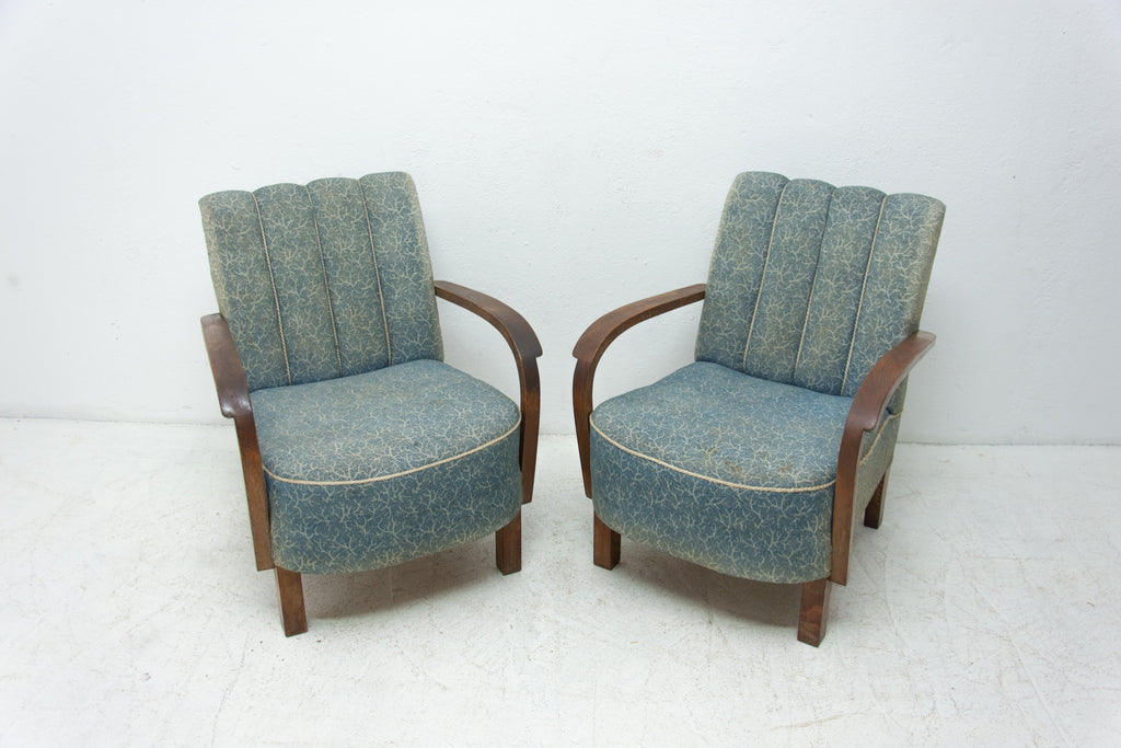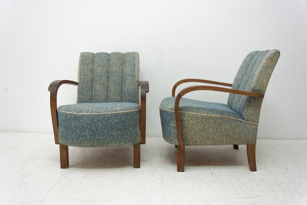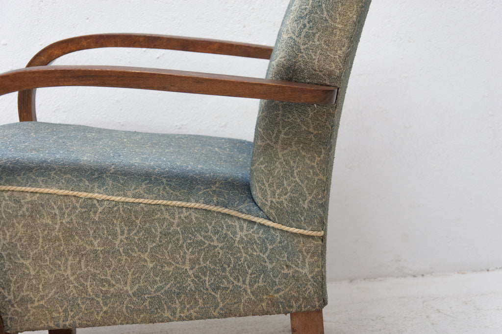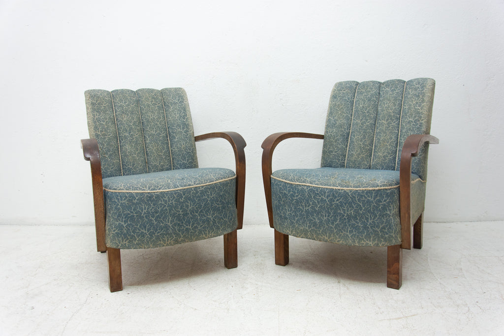 These bentwood armchairs Cataloque No. were designed by Jindřich Halabala and produced by UP Závody in the 1930´s. The chairs are stable and comfortable. The structure and upholstery are in good preserved condition, the fabric is faded in places. See pictures. Price is for the pair.