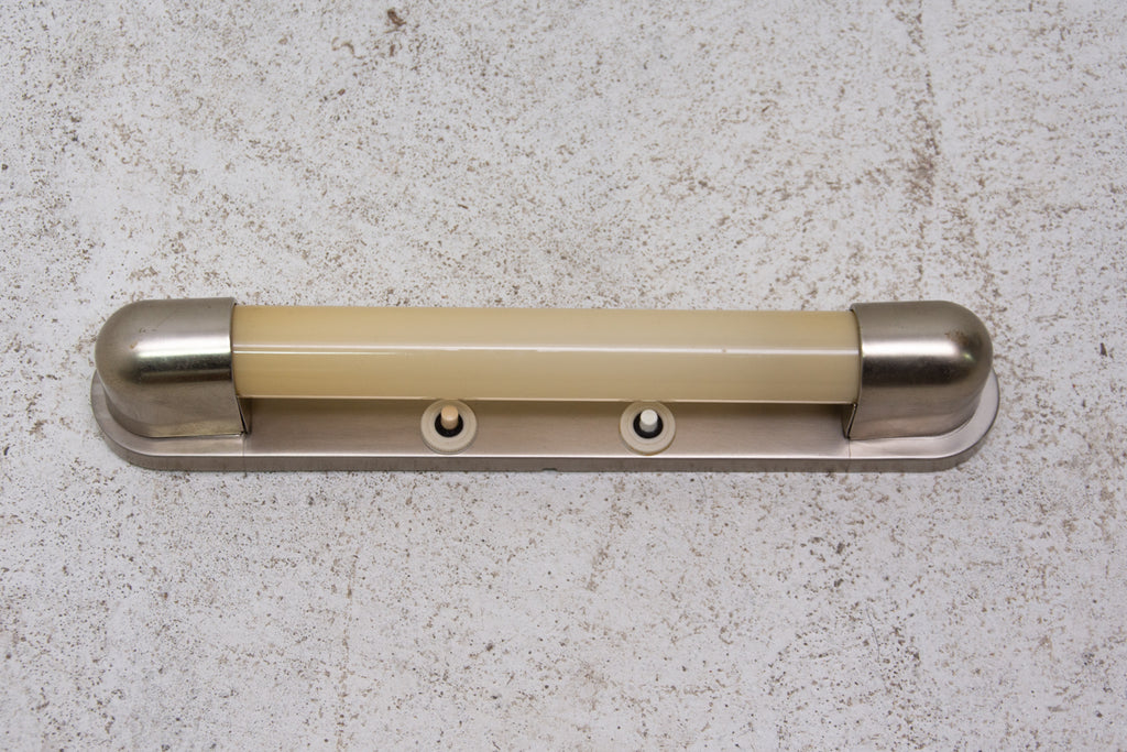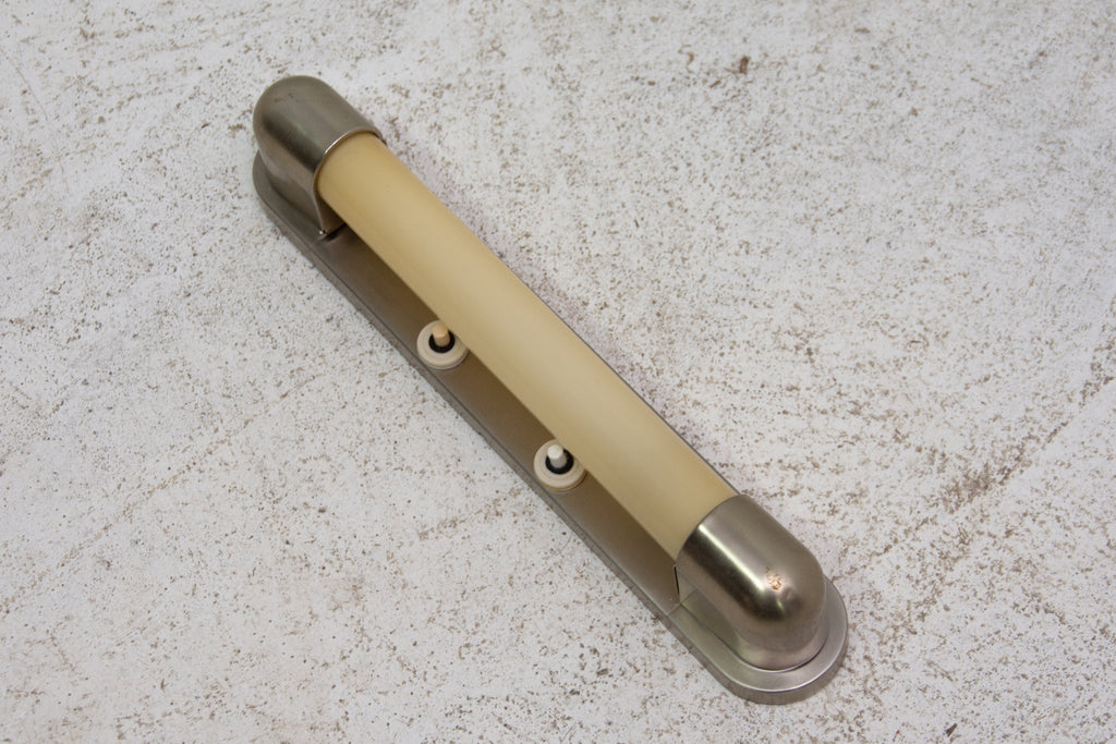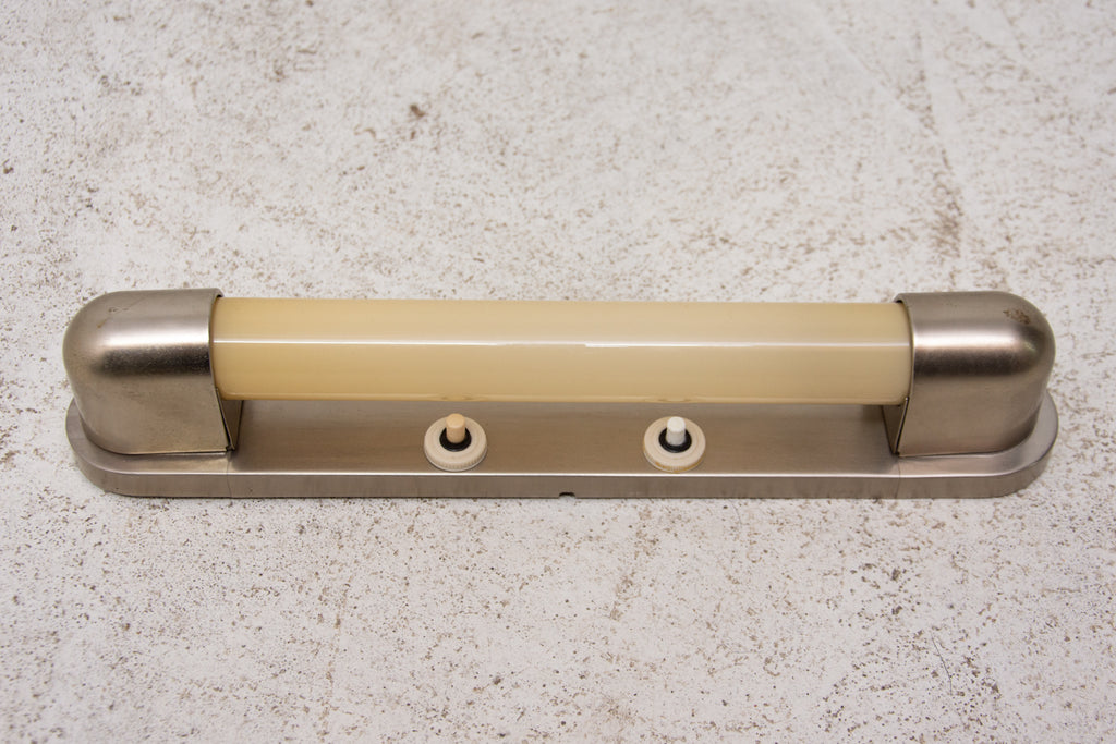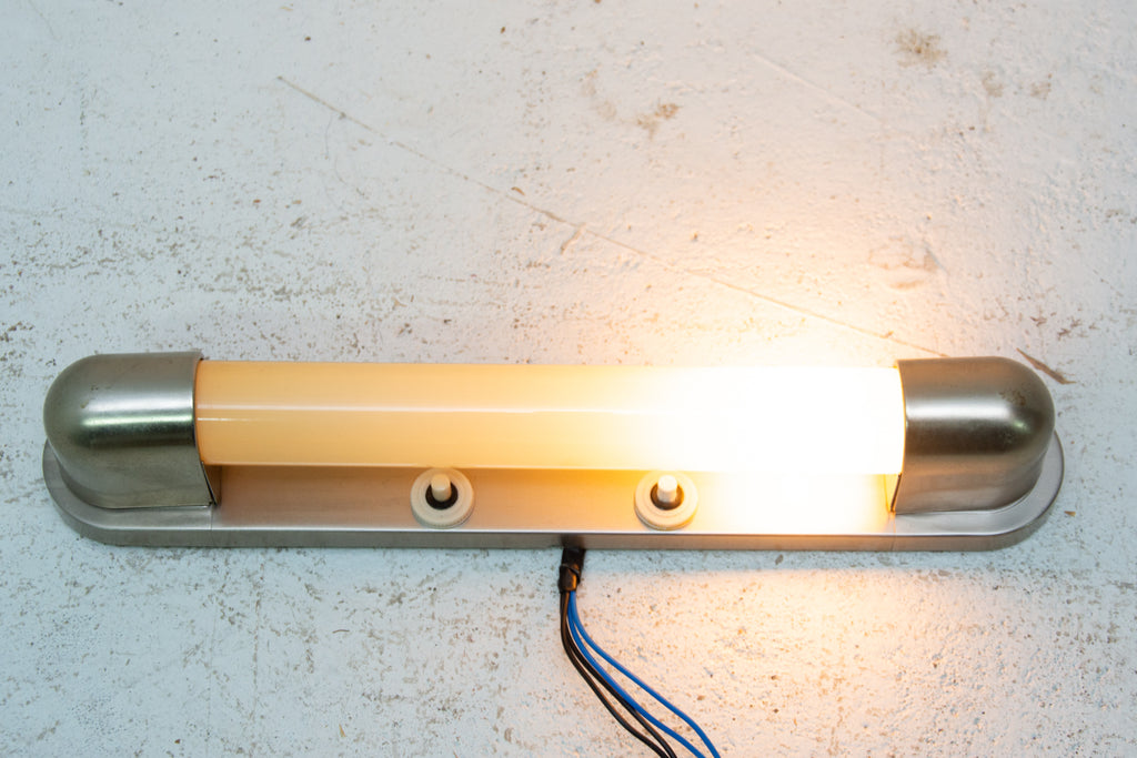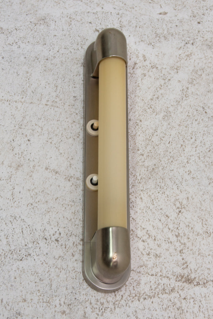 Metal wall lamp from the Bauhaus period. It was made in the former Czechoslovakia, Central Europe in the 1940´s. Beautiful example of the European functionalism. In very good Vintage condition, fully functional. It works with two E14 bulbs.