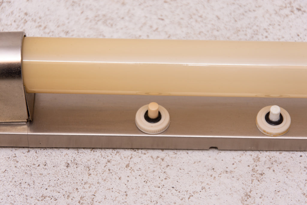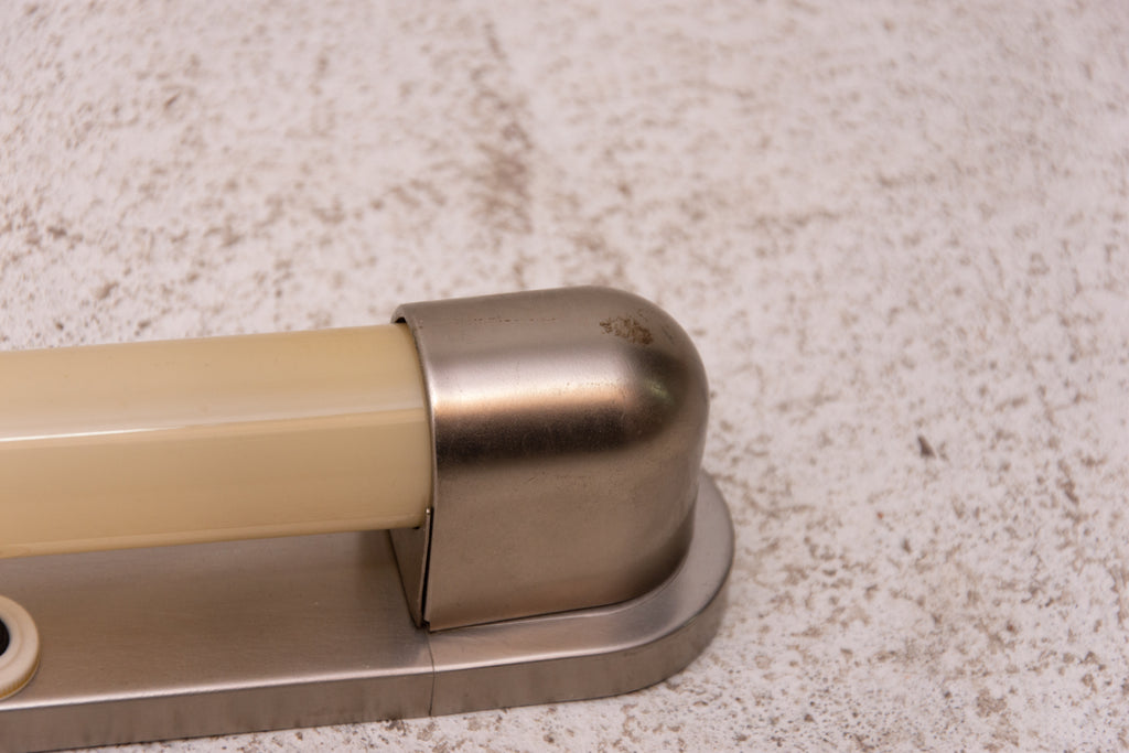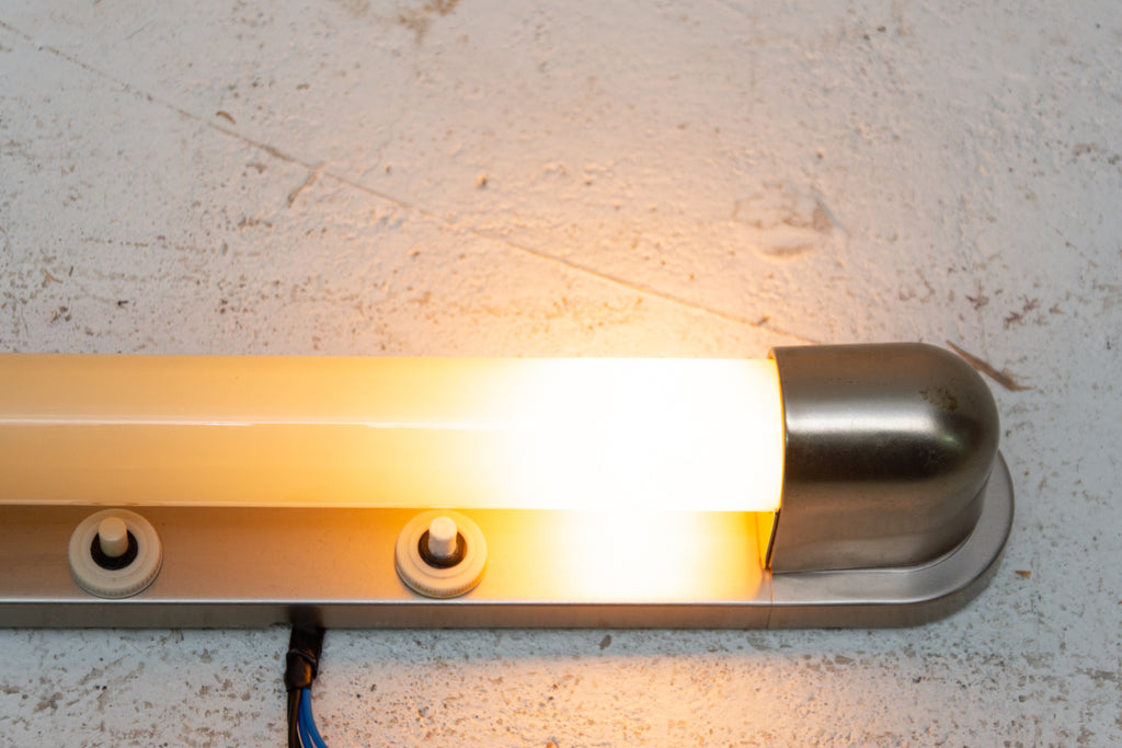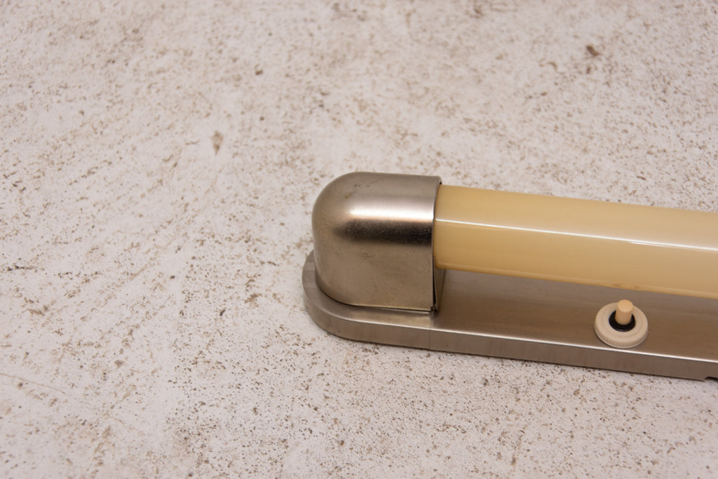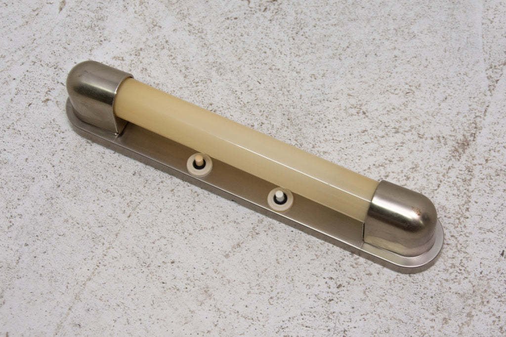 Metal wall lamp from the Bauhaus period. It was made in the former Czechoslovakia, Central Europe in the 1940´s. Beautiful example of the European functionalism. In very good Vintage condition, fully functional. It works with two E14 bulbs.