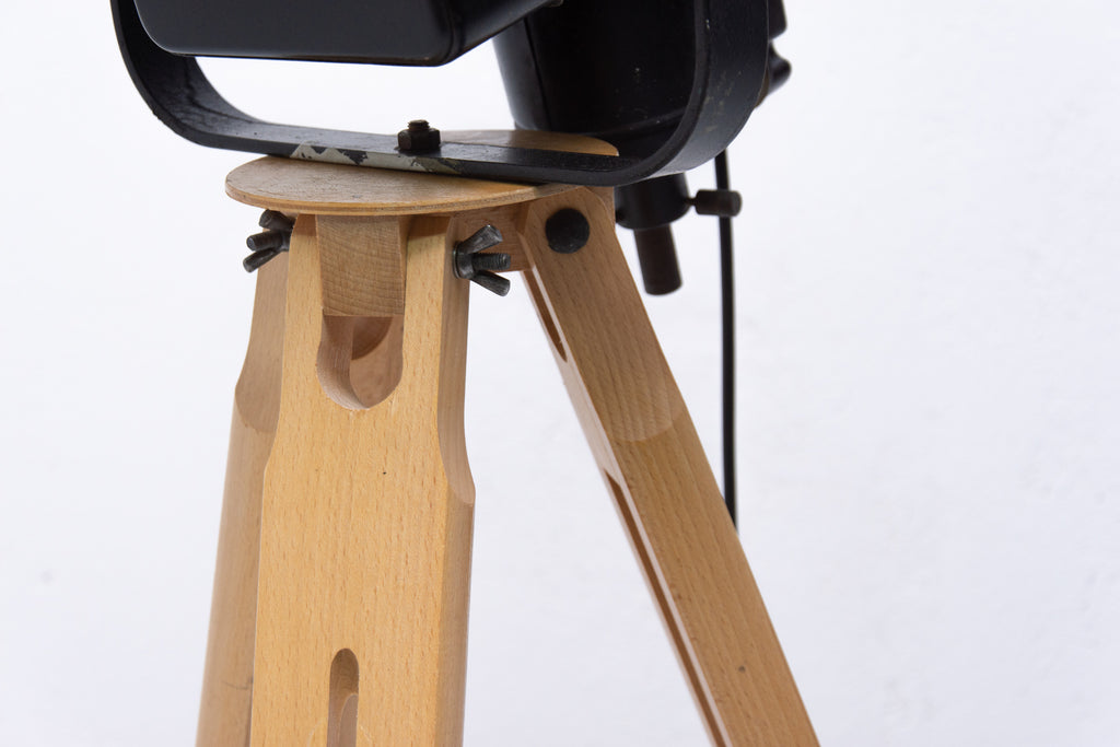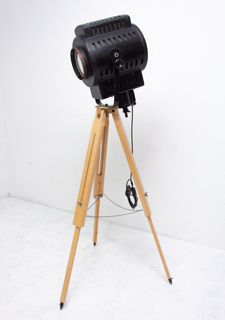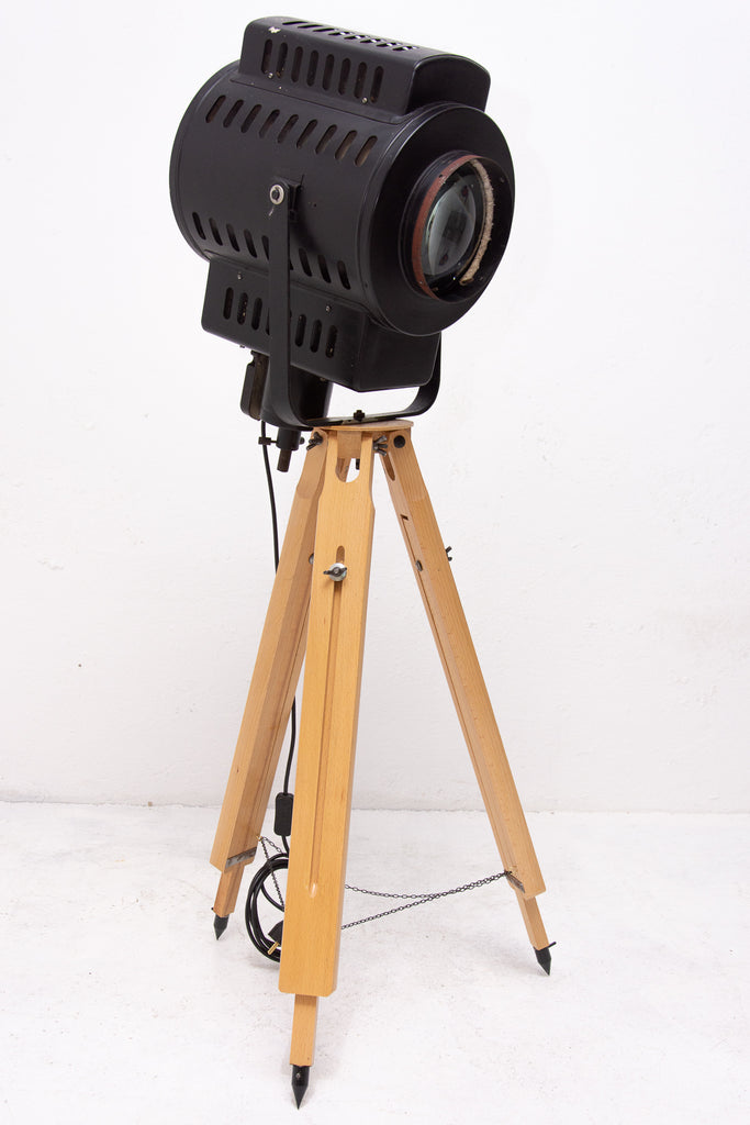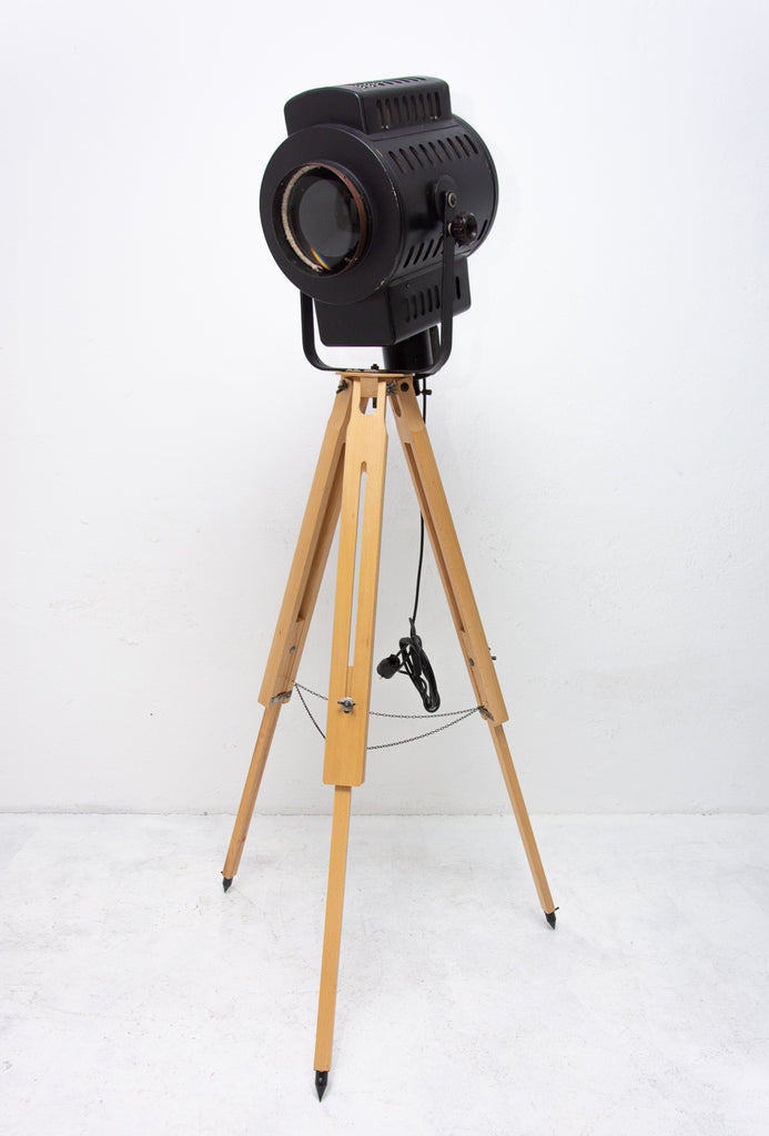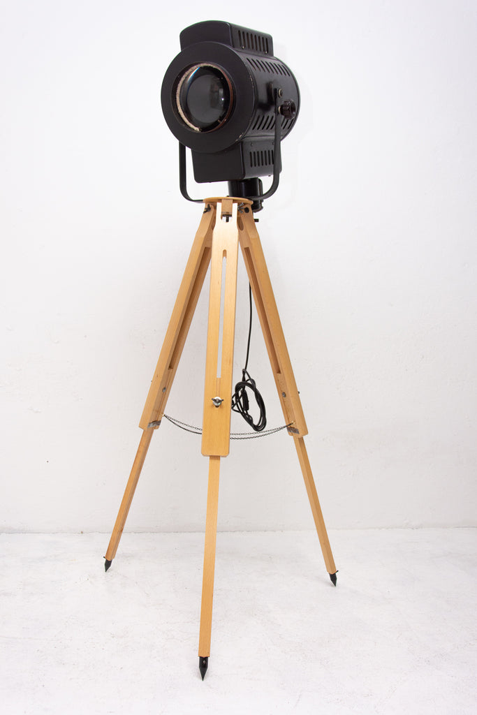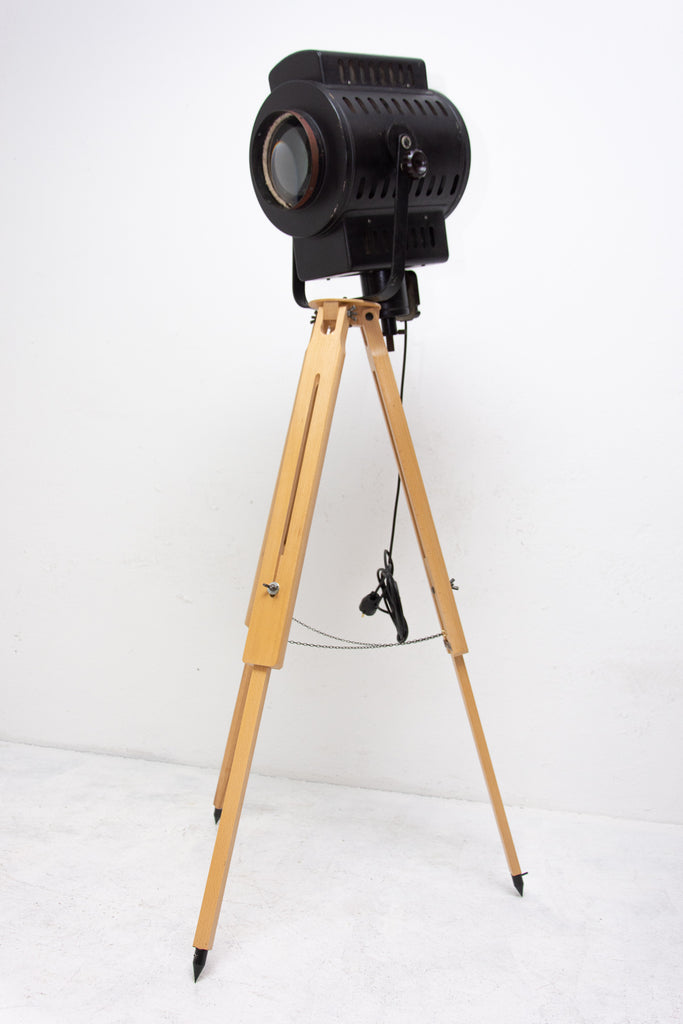 Vintage Industrial spotlight on a wooden tripod. It was made in the former Czechoslovakia in the 1970s. It features an original large rounded shade. Provides a high level of lighting. An outstanding and attractive model. To be used for theatre production etc.. One large E40 1000 W bulb.