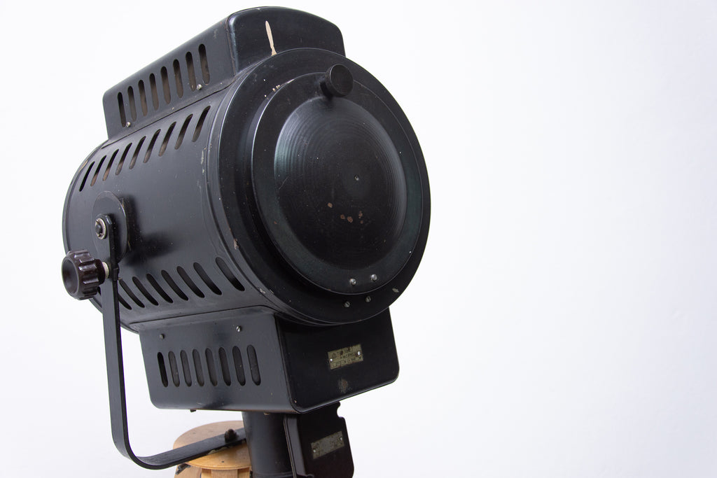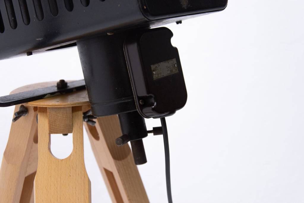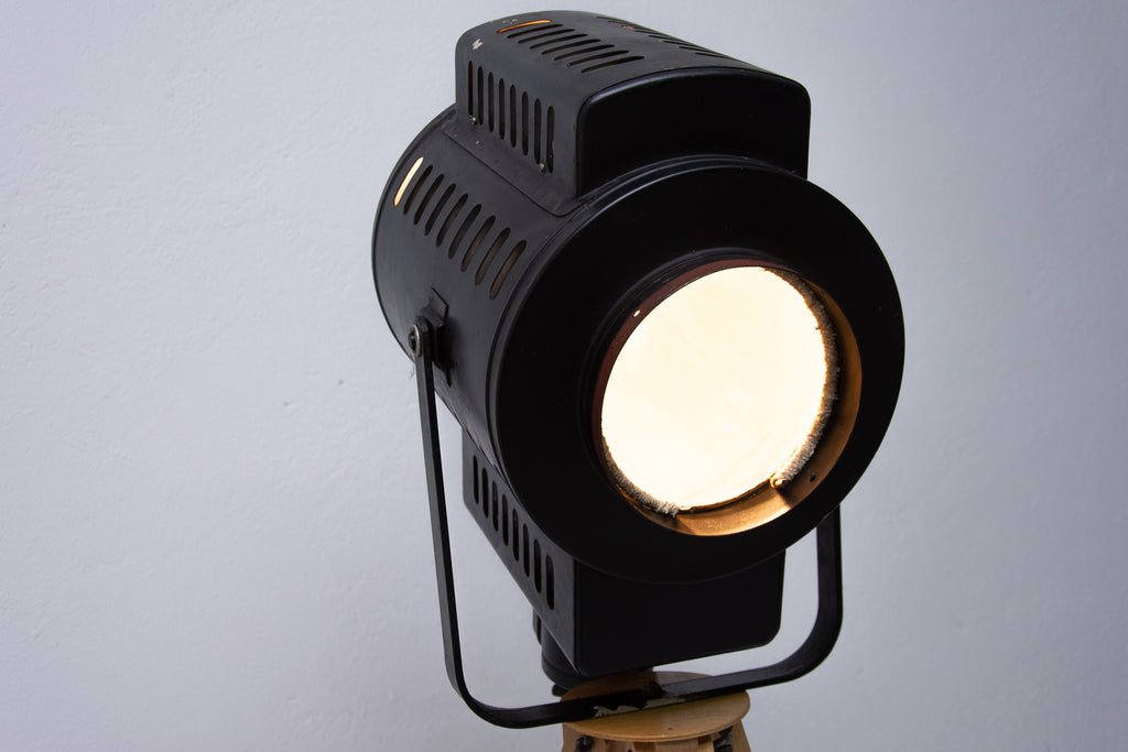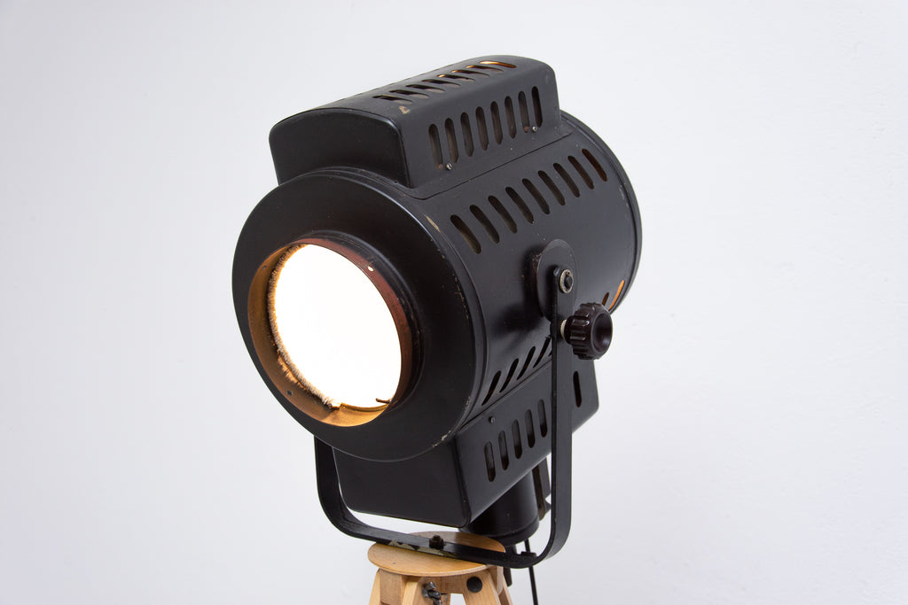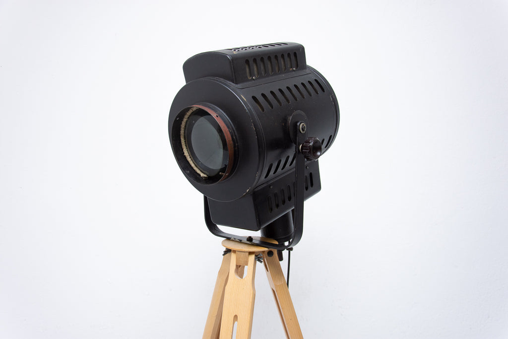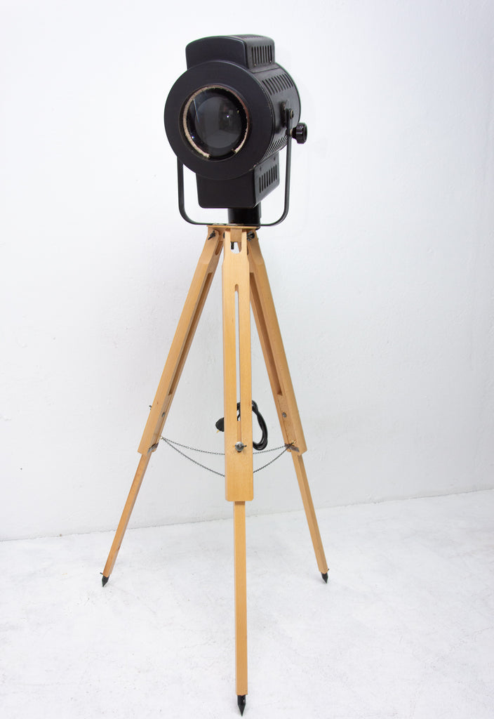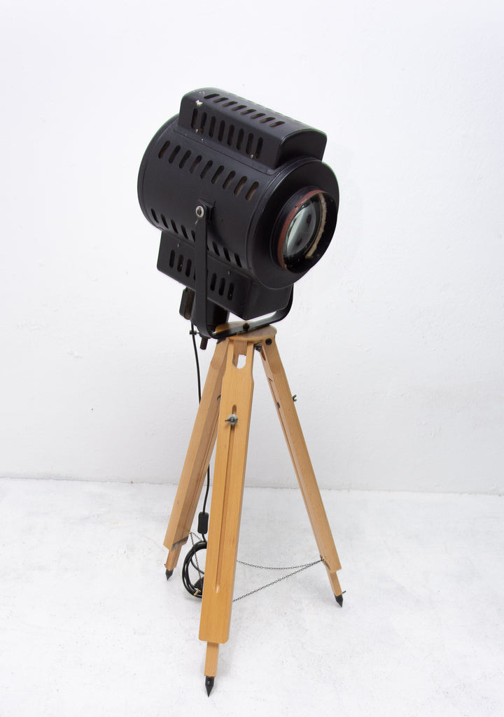 Vintage Industrial spotlight on a wooden tripod. It was made in the former Czechoslovakia in the 1970s. It features an original large rounded shade. Provides a high level of lighting. An outstanding and attractive model. To be used for theatre production etc.. One large E40 1000 W bulb.