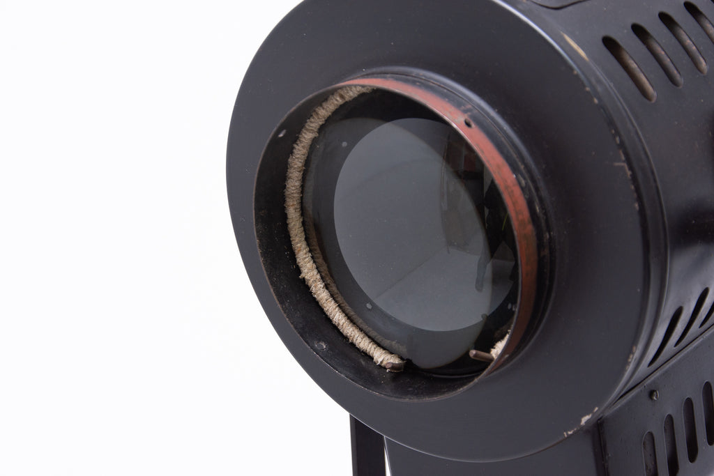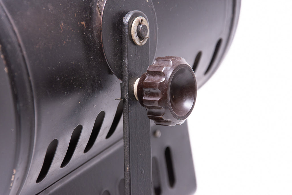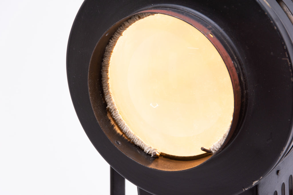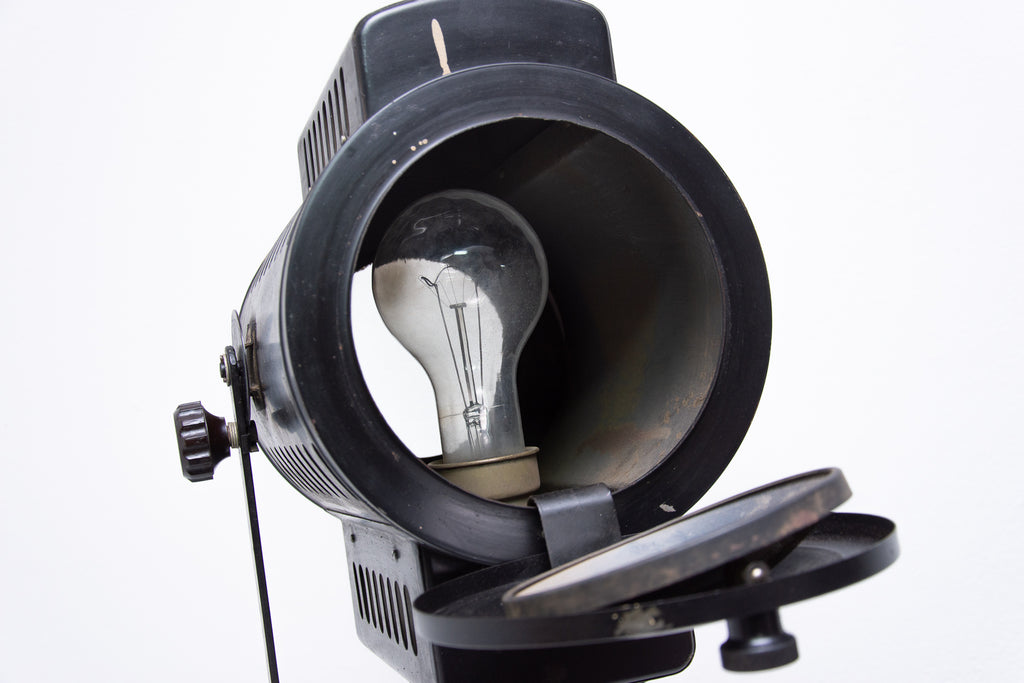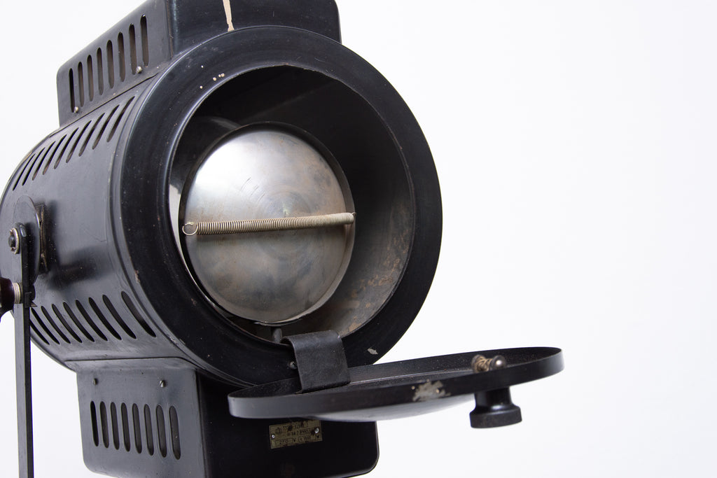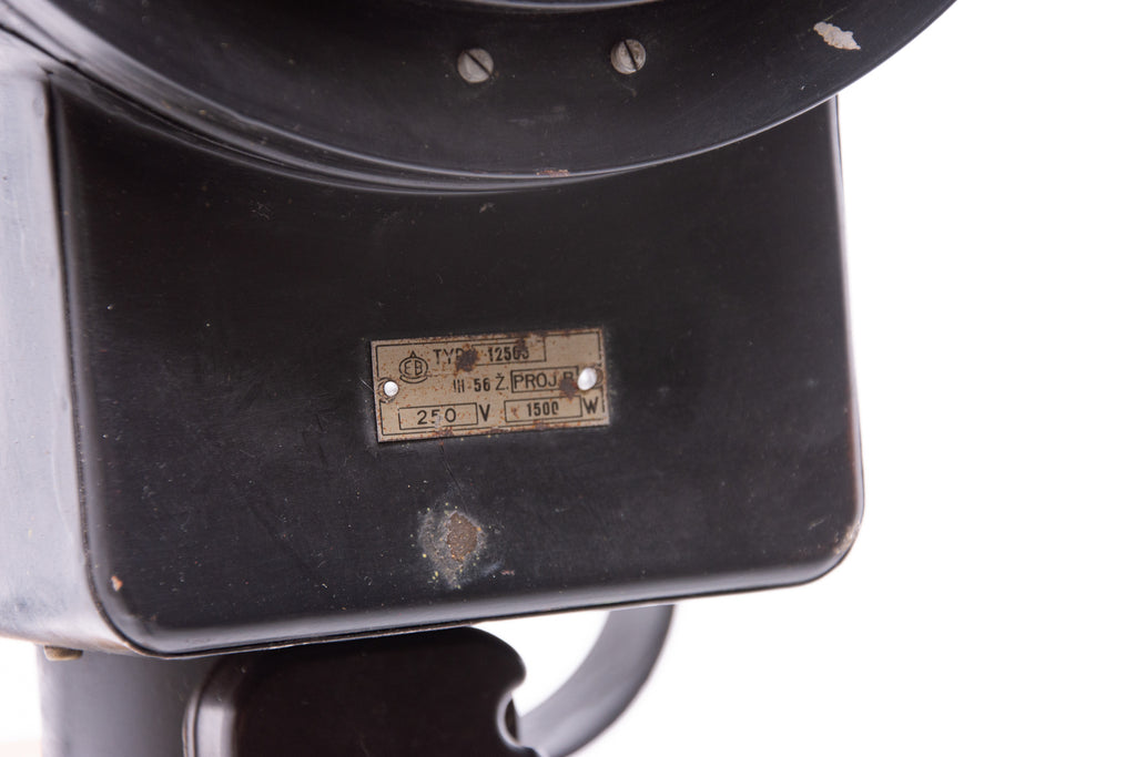 Vintage Industrial spotlight on a wooden tripod. It was made in the former Czechoslovakia in the 1970s. It features an original large rounded shade. Provides a high level of lighting. An outstanding and attractive model. To be used for theatre production etc.. One large E40 1000 W bulb.