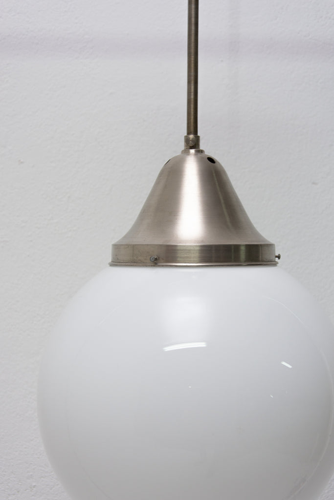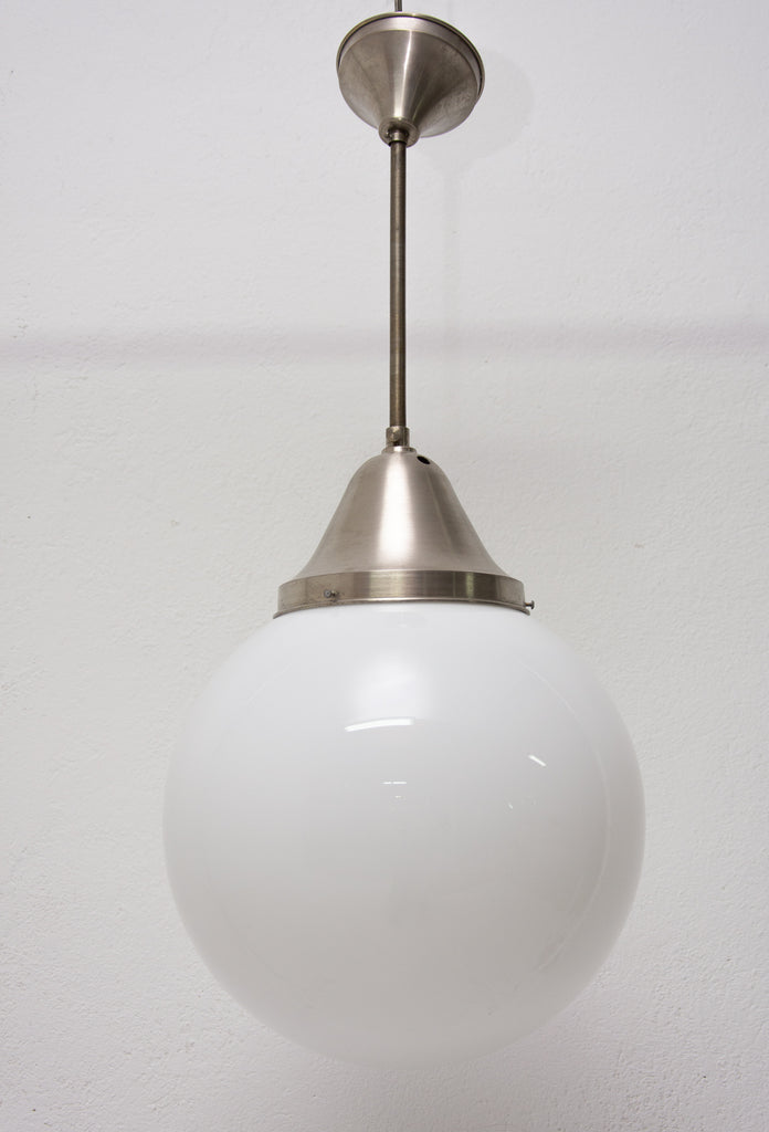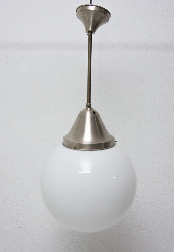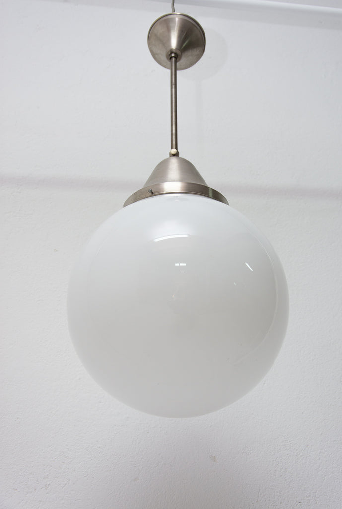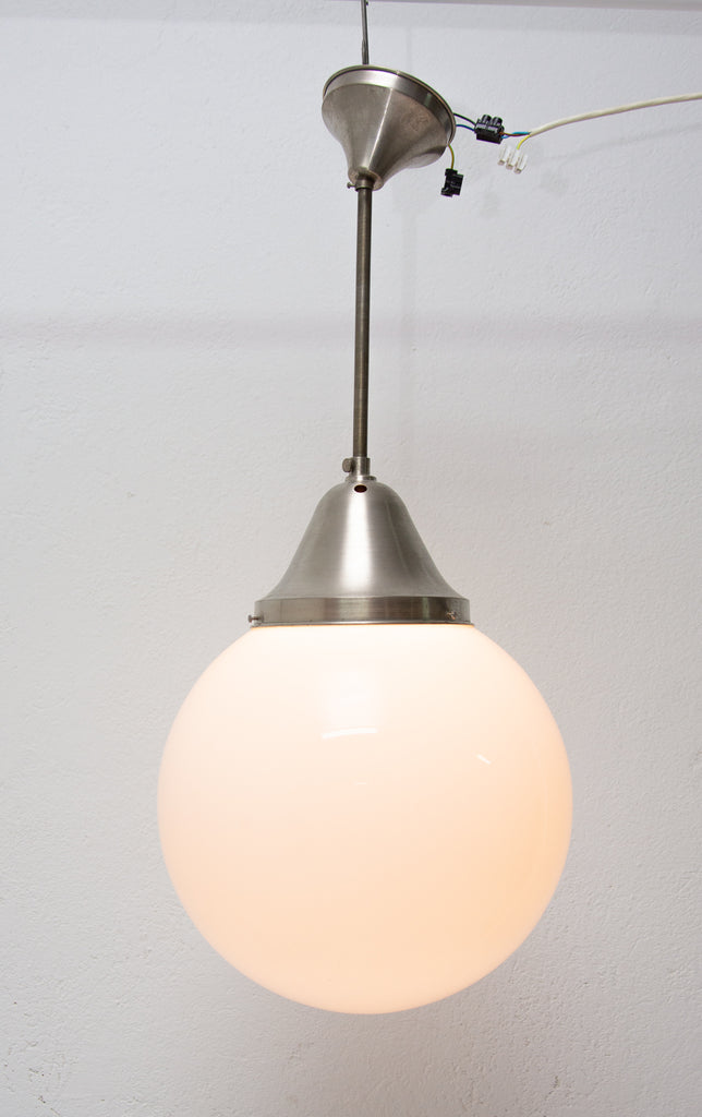 Bauhaus pendant lamp, made in the former Czechoslovakia in the 1930´s. Round opaque glass with a chrome-plated rod. In very good condition. New wiring.