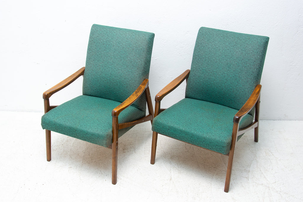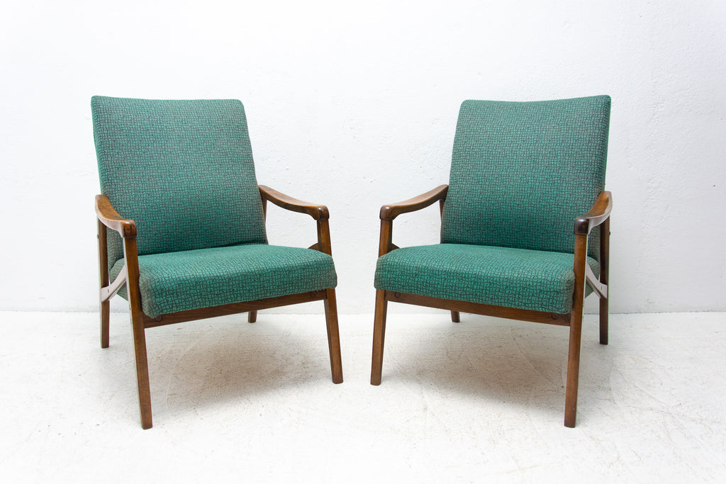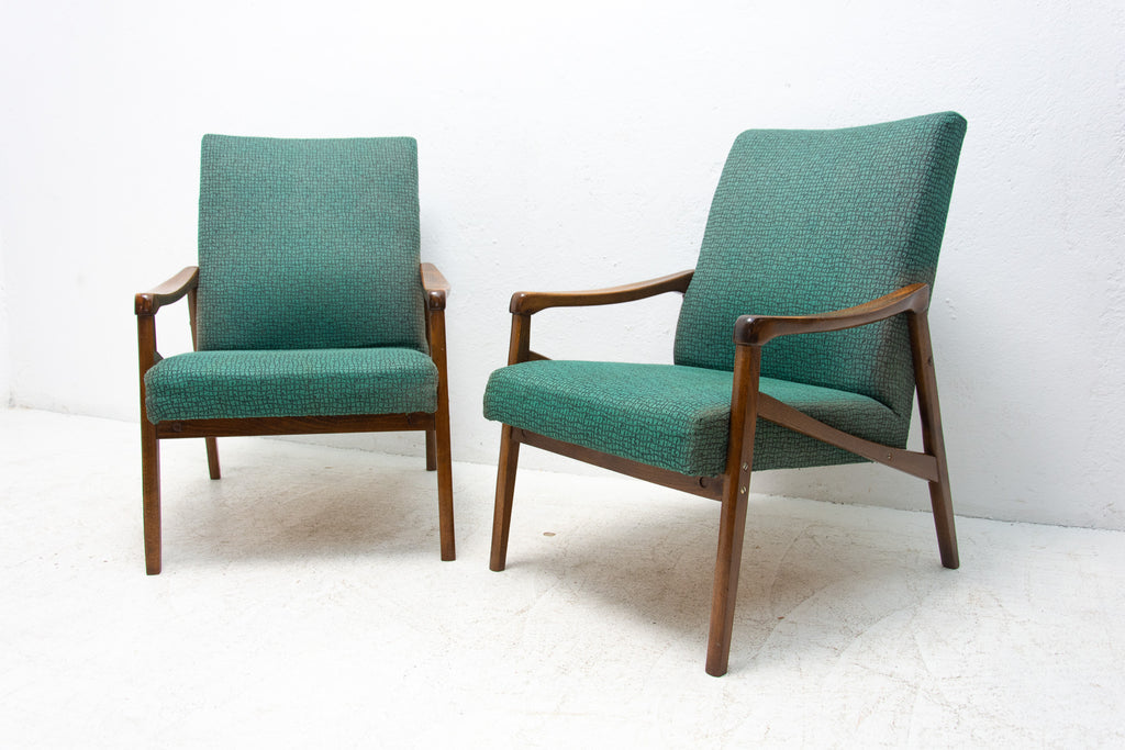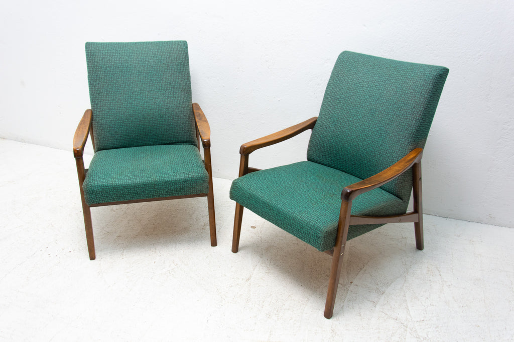 Pair of armchairs, made in the former Czechoslovakia in the 1970´s. It was designed by Jiří Jiroutek for Interiér Praha as part of U-550 living room set. The structure is made of beech wood and the chairs have original upholstery. The chairs are in good Vintage condition, bears slight signs of age and using. Price is for the pair