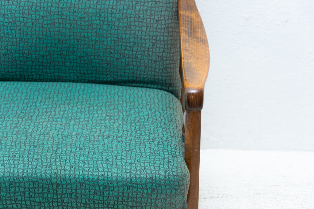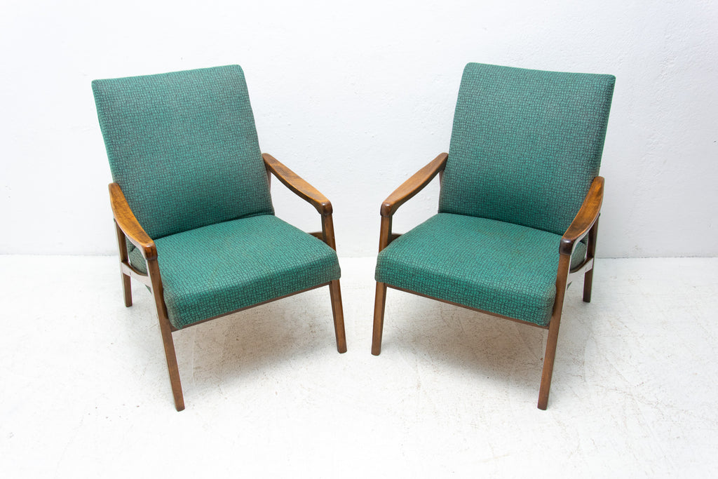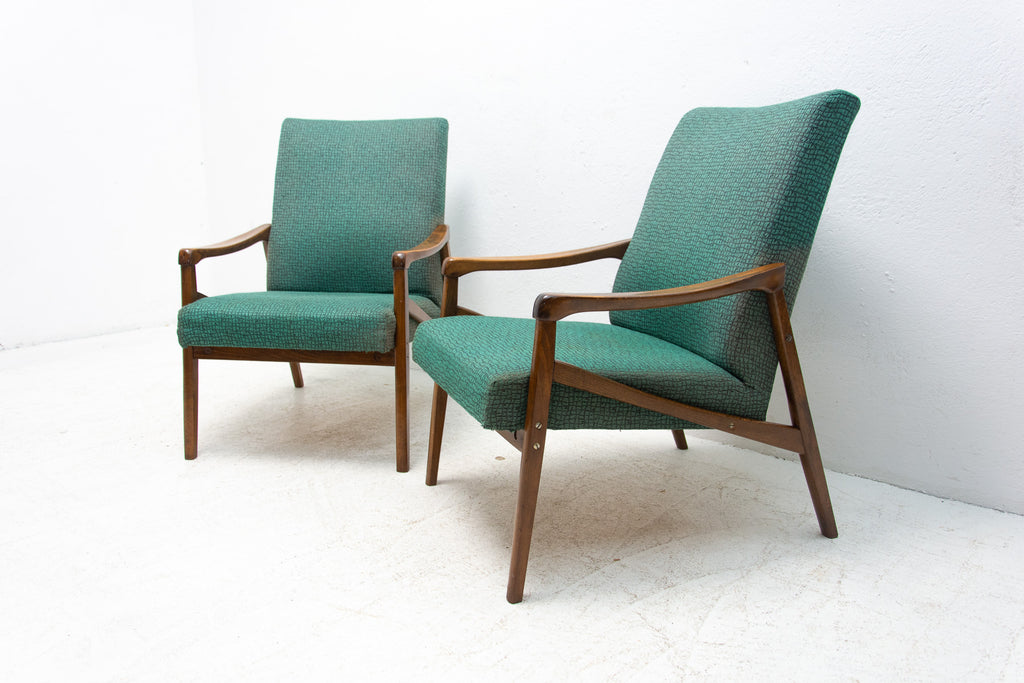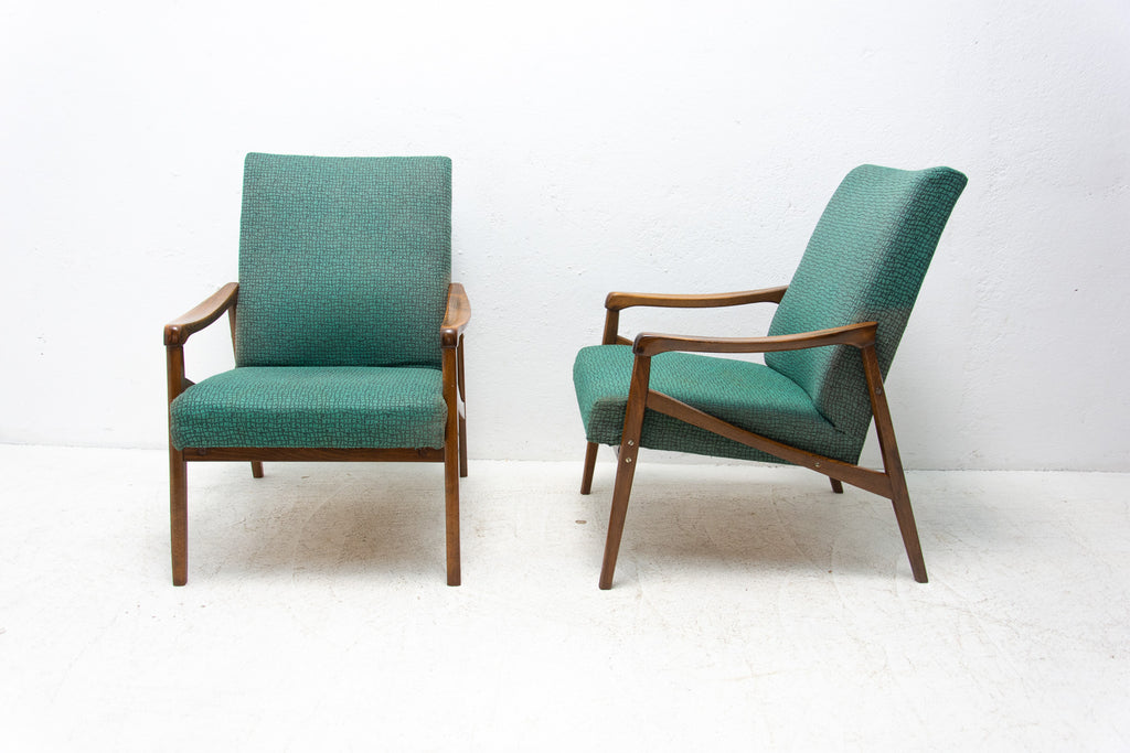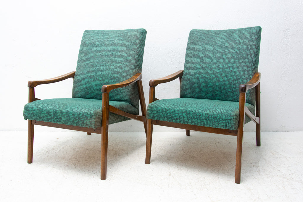Pair of armchairs, made in the former Czechoslovakia in the 1970´s. It was designed by Jiří Jiroutek for Interiér Praha as part of U-550 living room set. The structure is made of beech wood and the chairs have original upholstery. The chairs are in good Vintage condition, bears slight signs of age and using. Price is for the pair