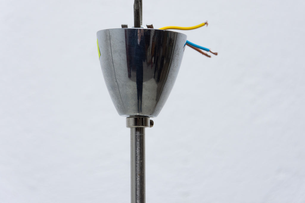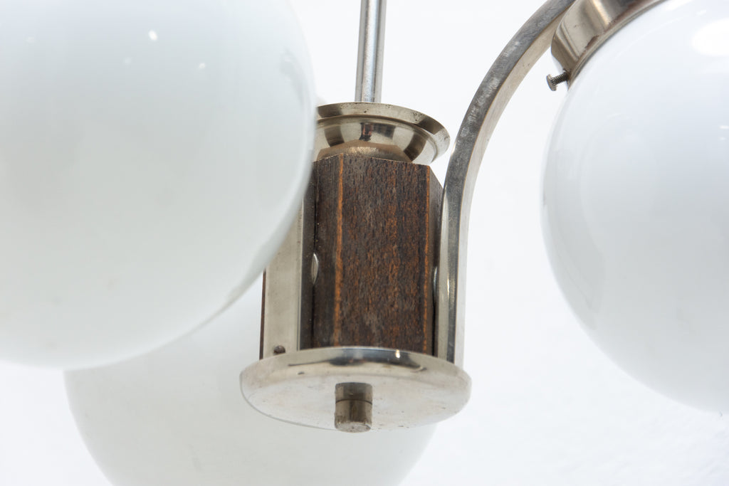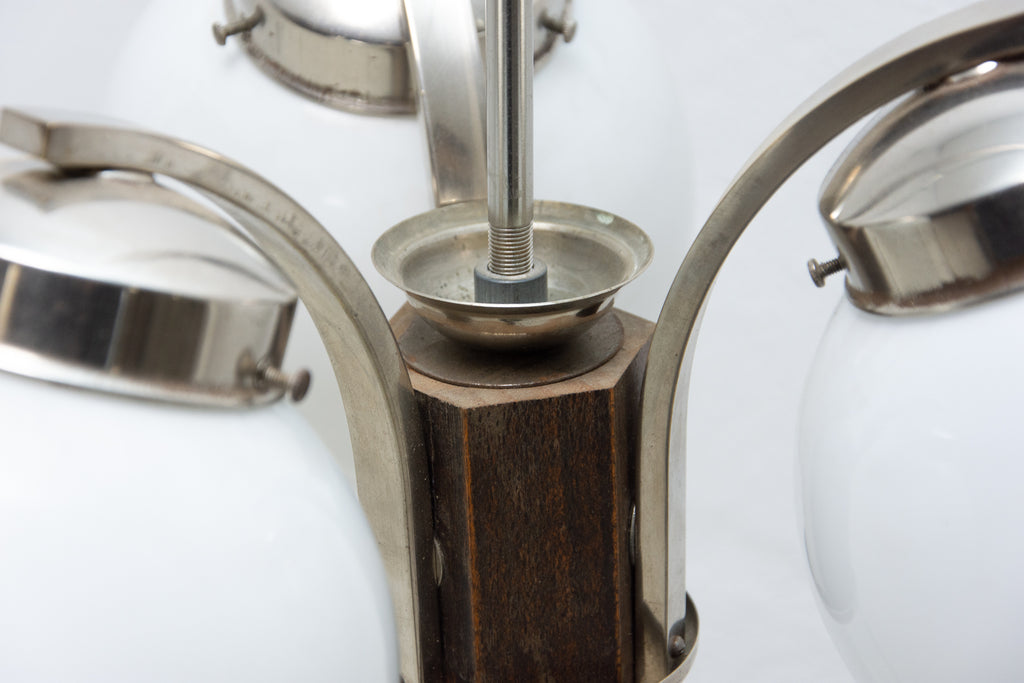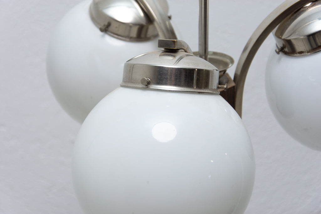 Art Deco three-armed chandelier in chrome with three curved arms, shades in milky glass, made in the 1930´s. New wiring.