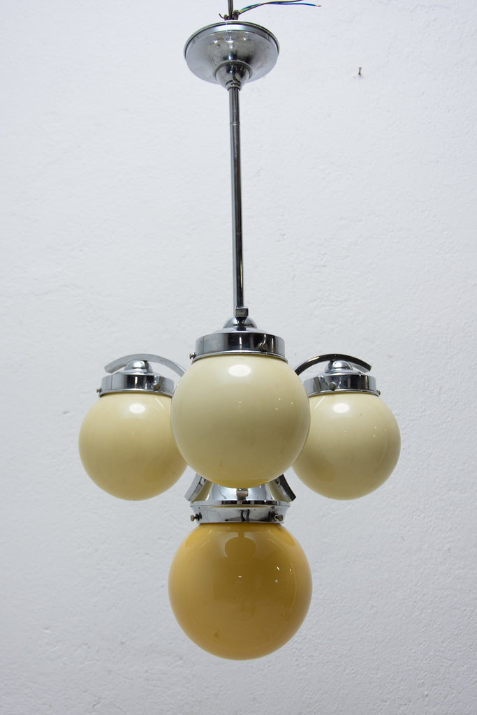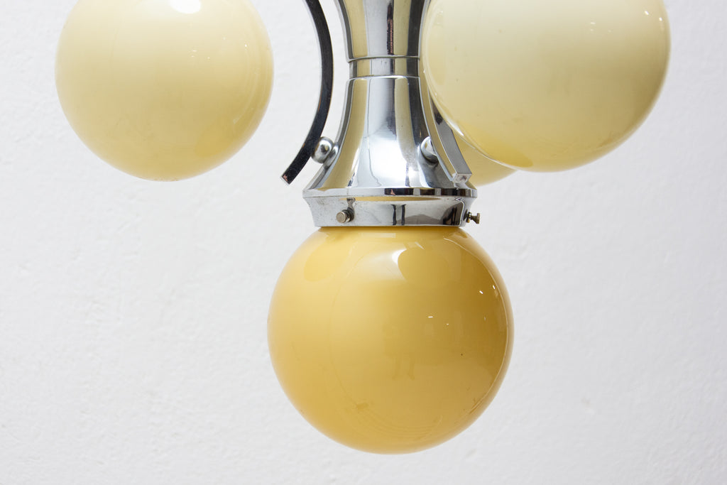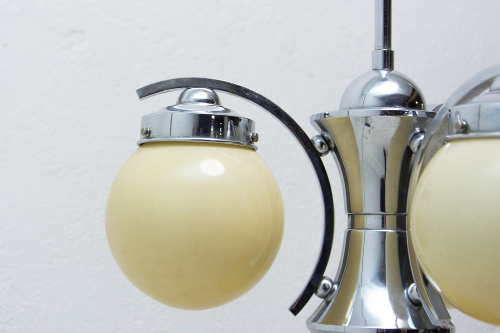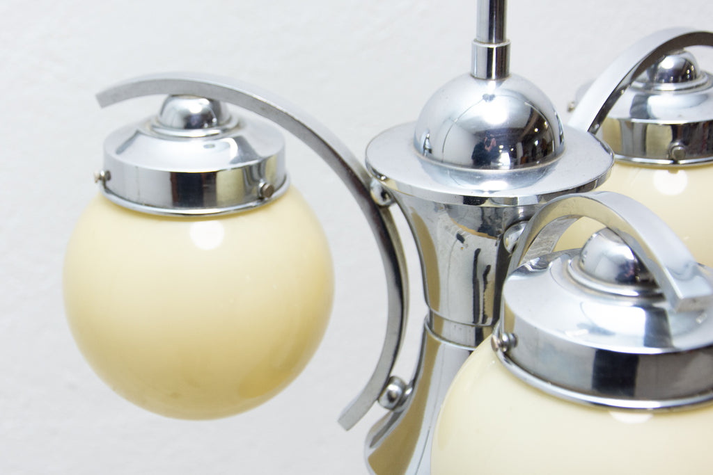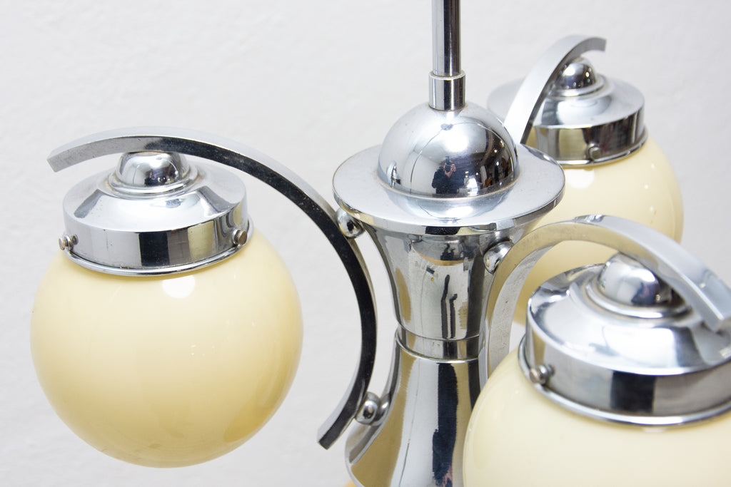 Art Deco three-armed chrome chandelier with three curved arms, shades in yellowish glass, made in the 1930´s. One ball has a slightly different shade of the yellow colour. New wiring.