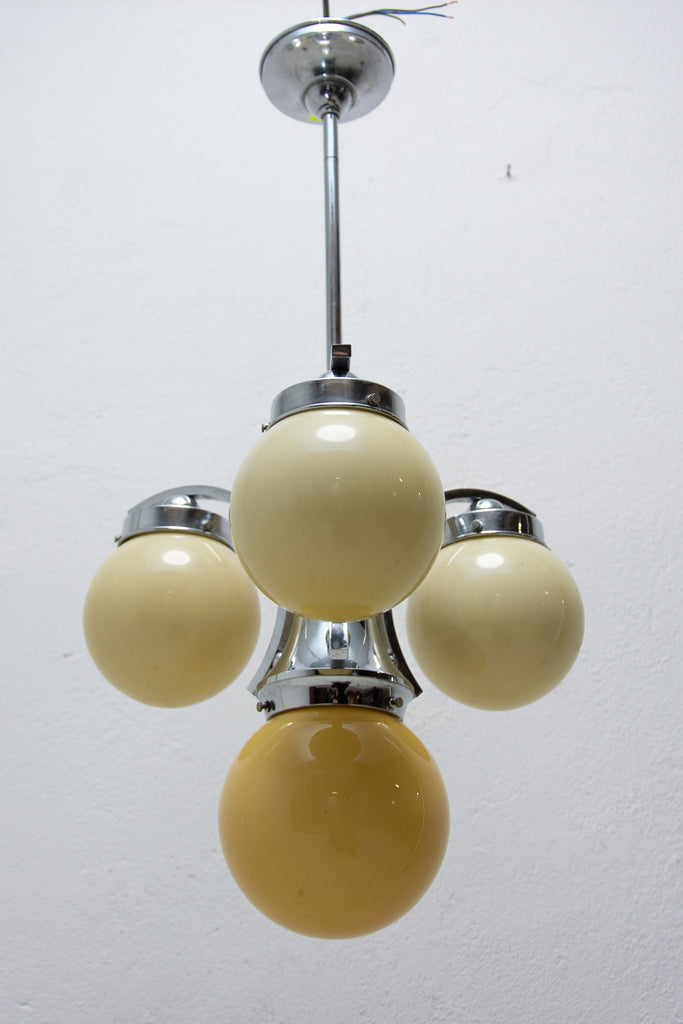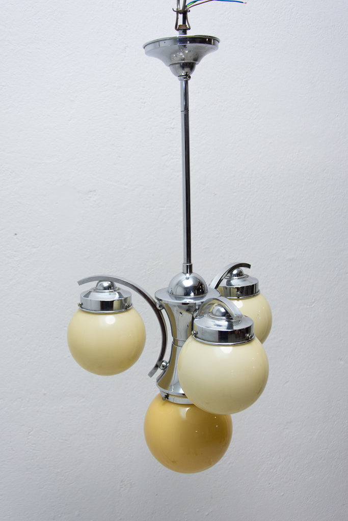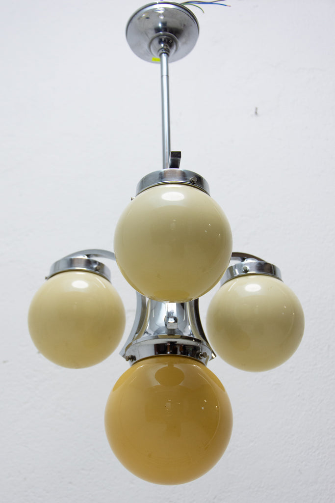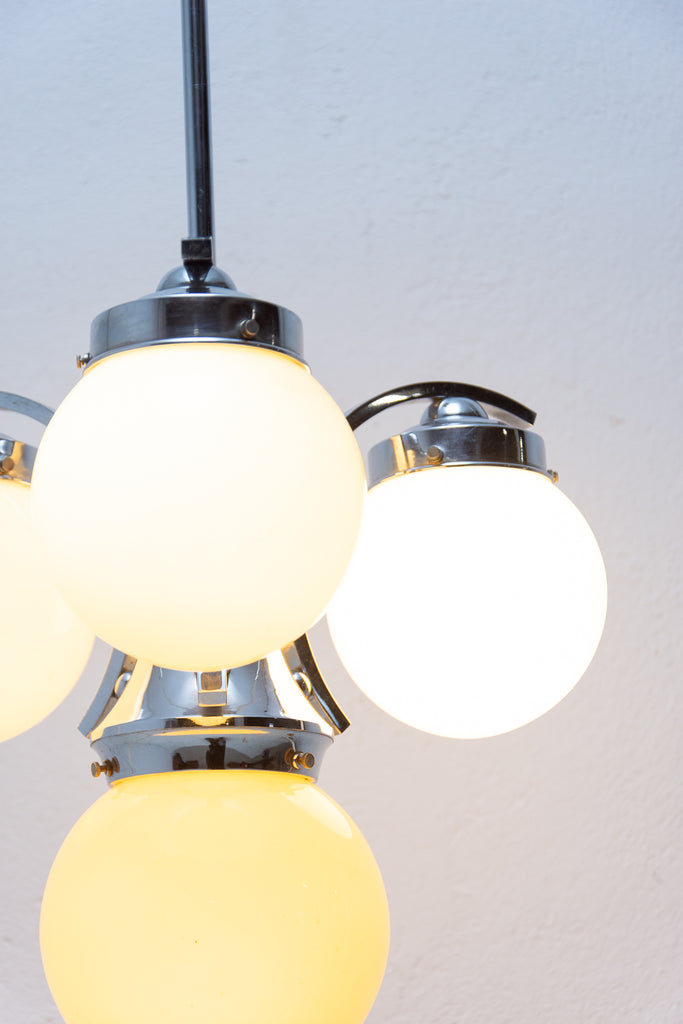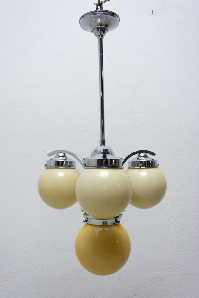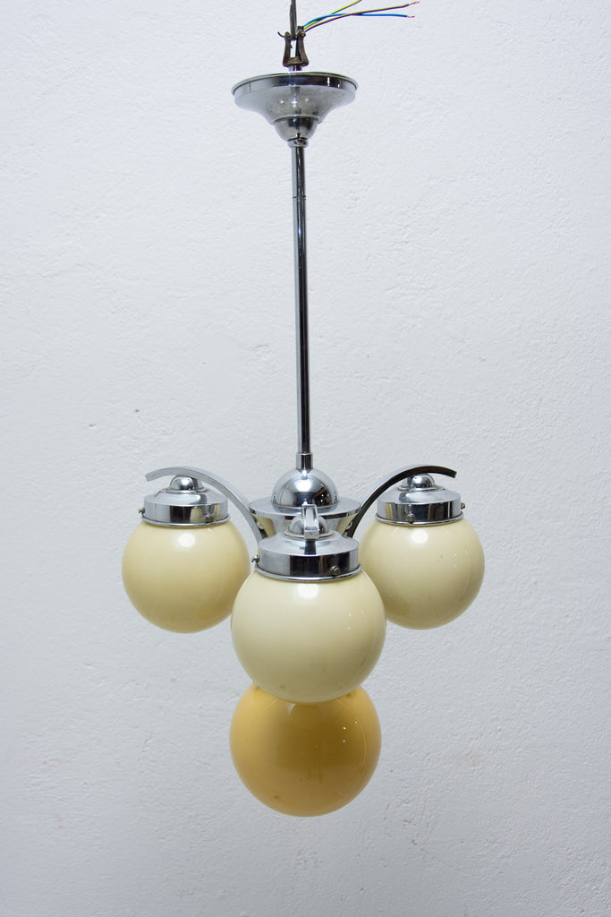 Art Deco three-armed chrome chandelier with three curved arms, shades in yellowish glass, made in the 1930´s. One ball has a slightly different shade of the yellow colour. New wiring.