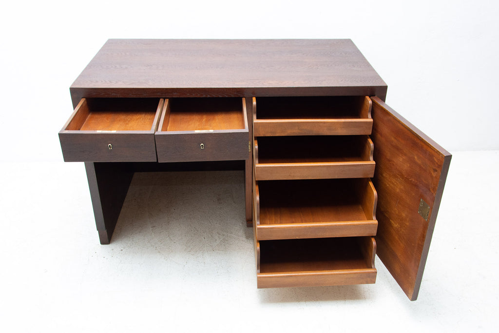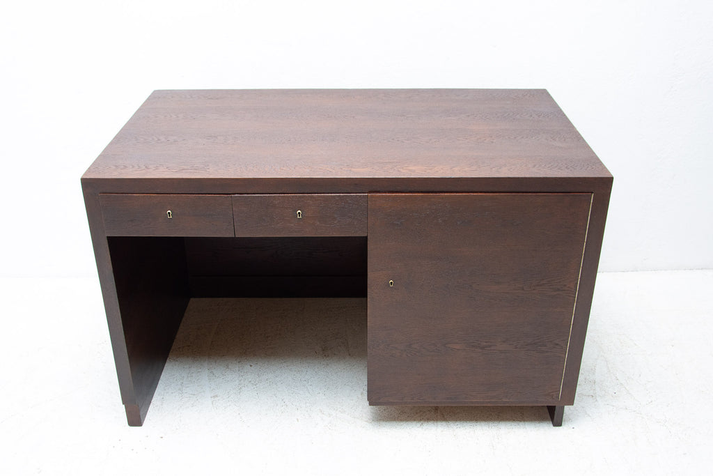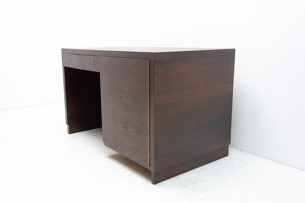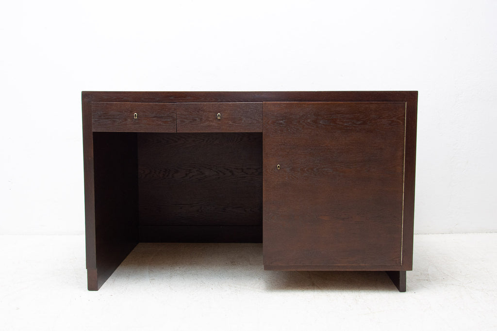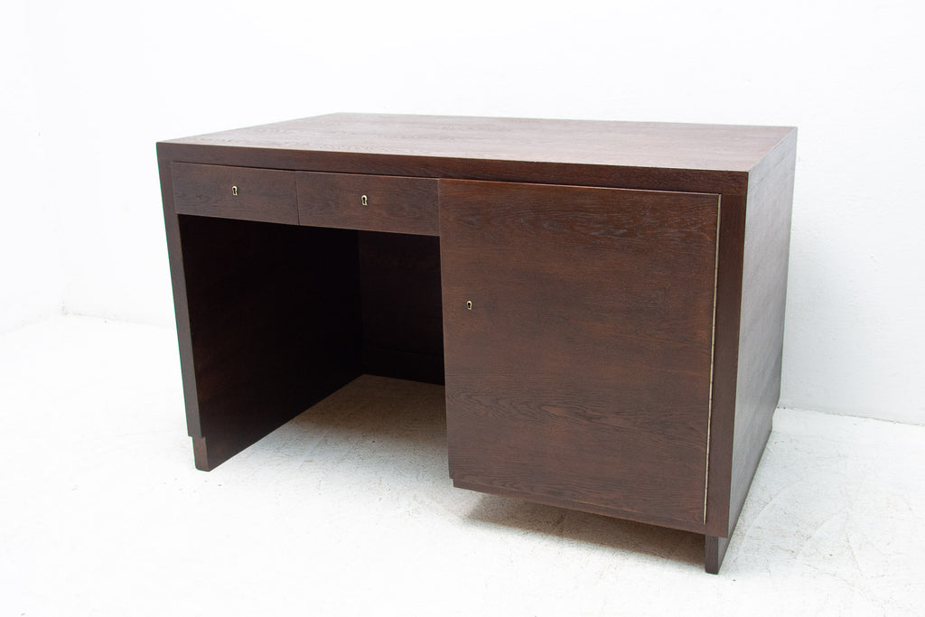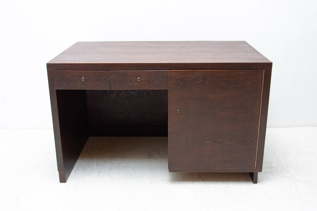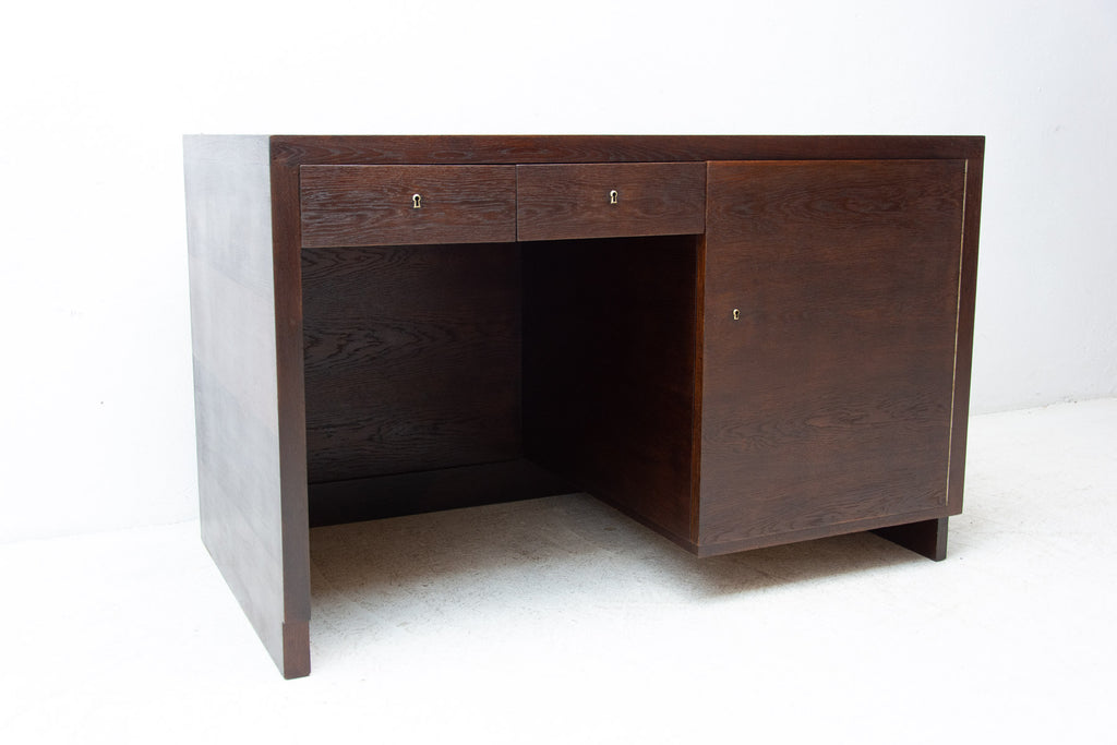 This massive functionalistic writing desk was made in the 1930s in Bohemia. It is veneered with oak veneer. Very interesting design typical for the functionalist period of the 1930s. The table is in very good condition, fully renovated.