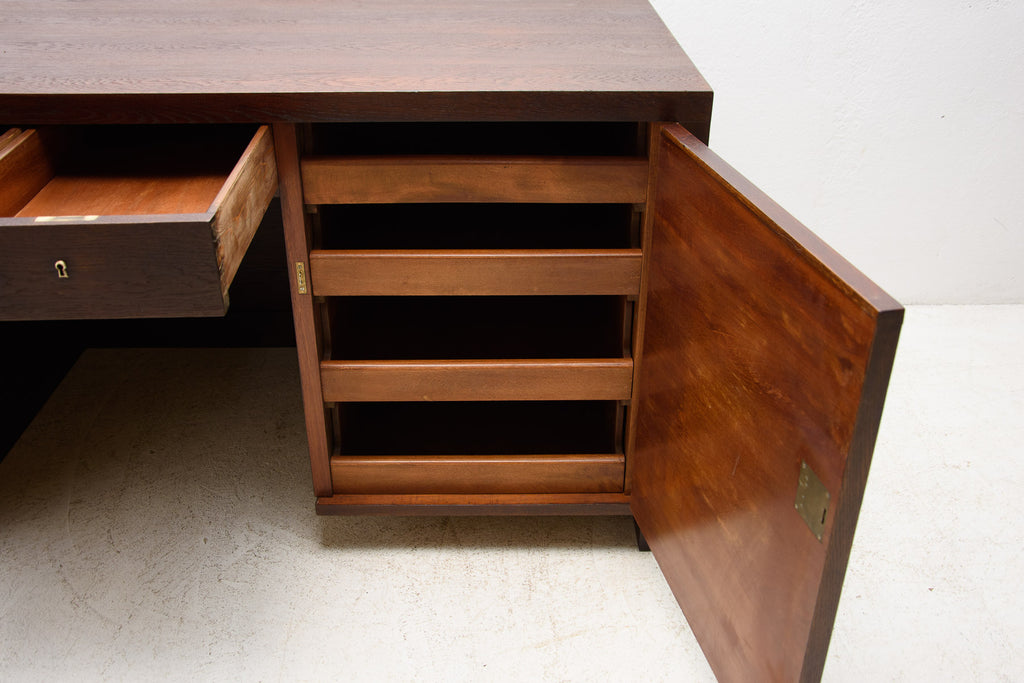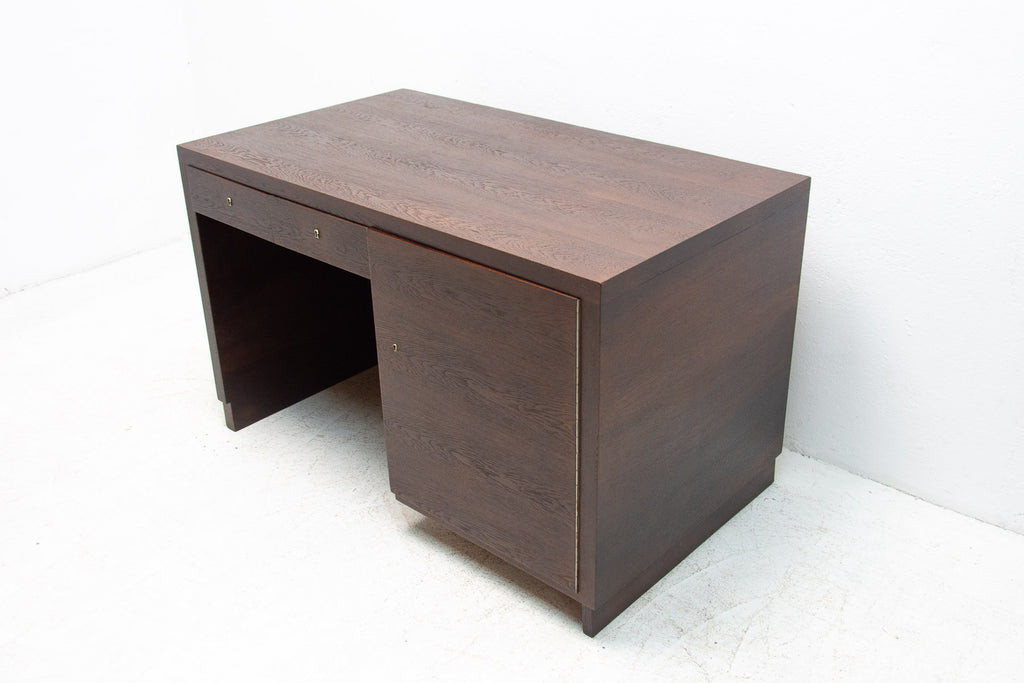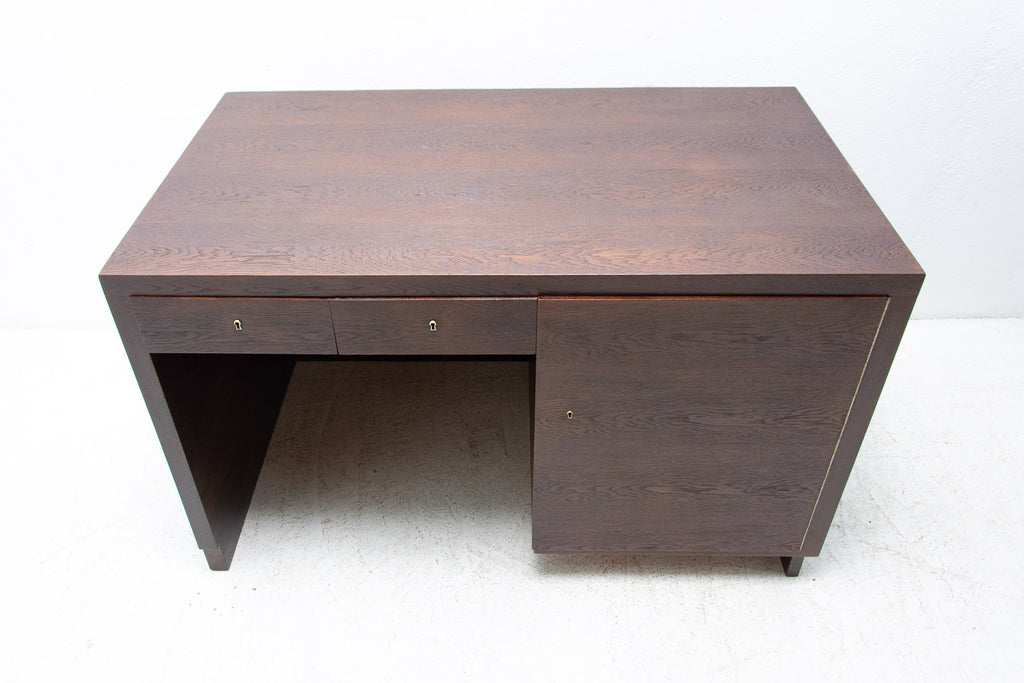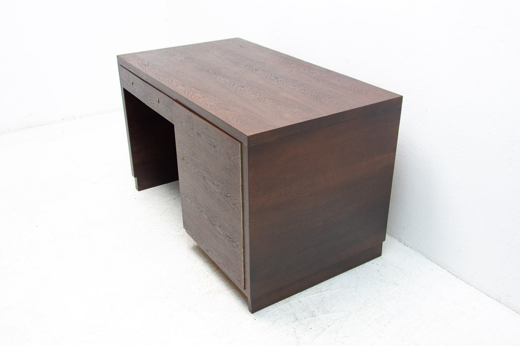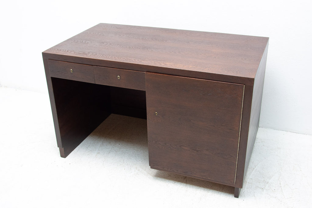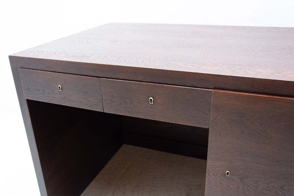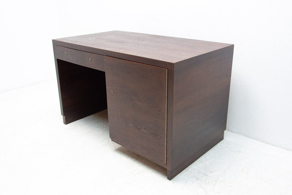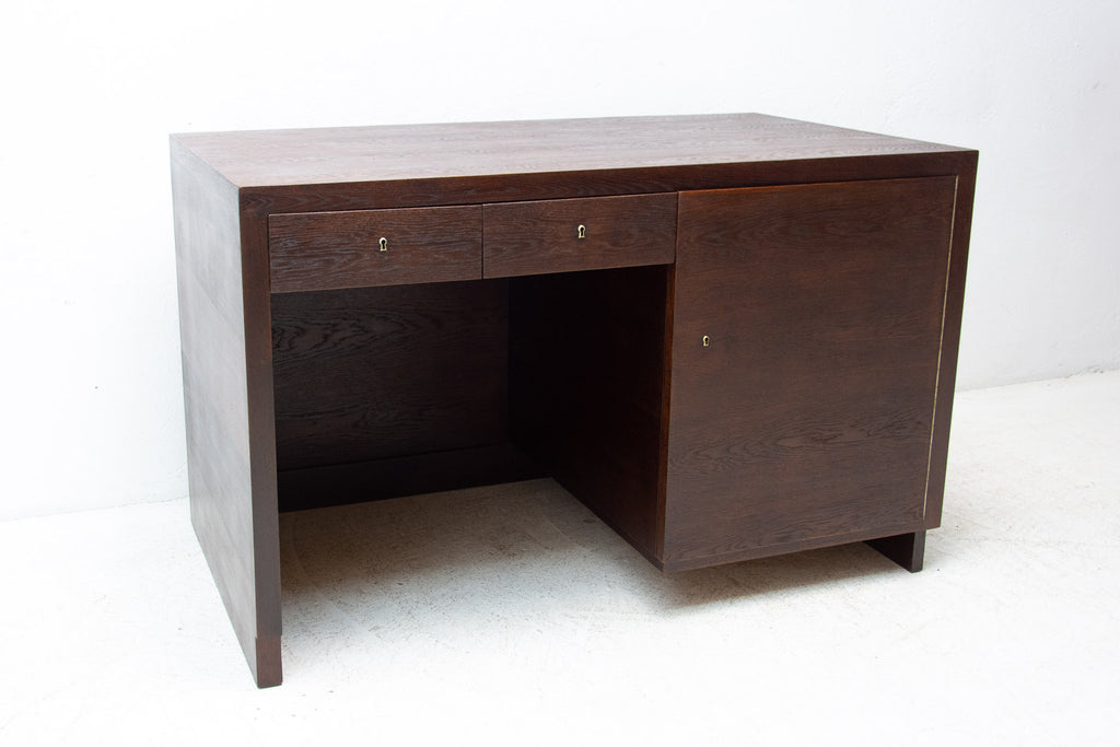 This massive functionalistic writing desk was made in the 1930s in Bohemia. It is veneered with oak veneer. Very interesting design typical for the functionalist period of the 1930s. The table is in very good condition, fully renovated.
