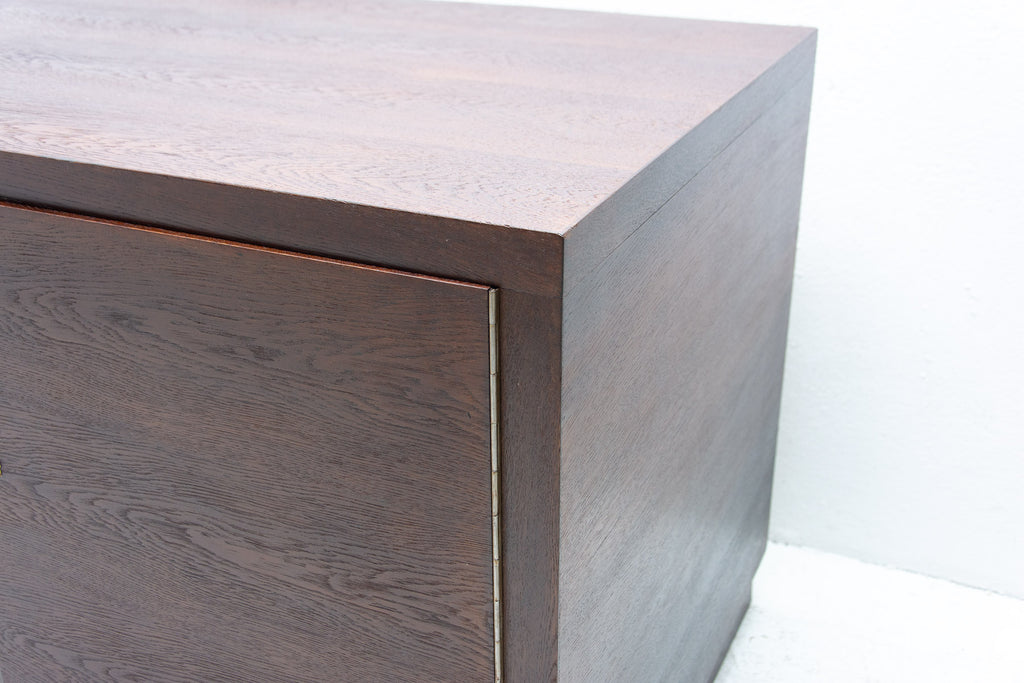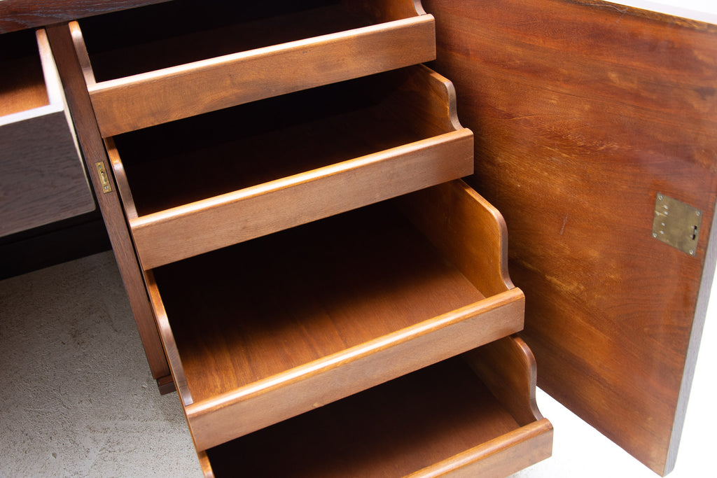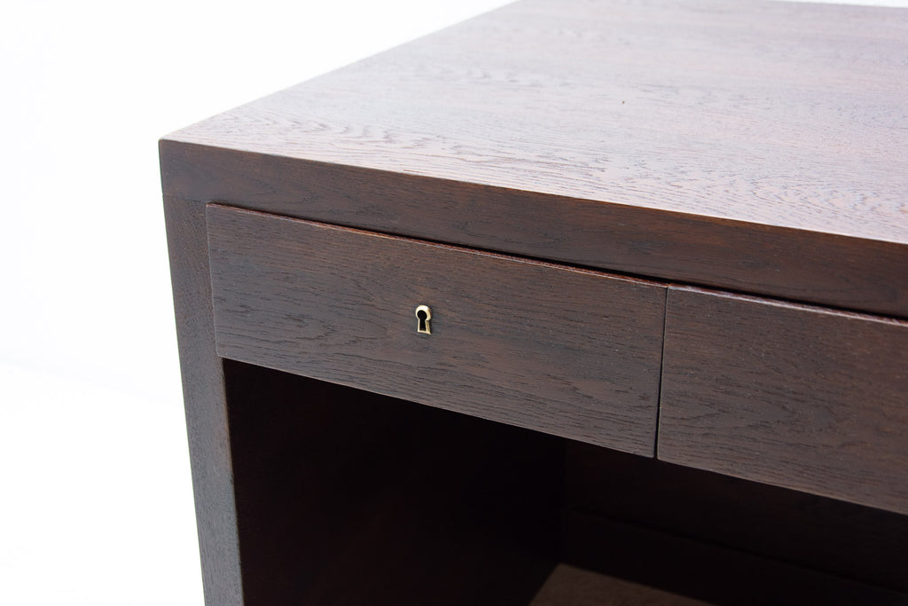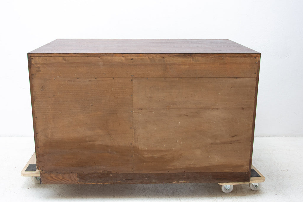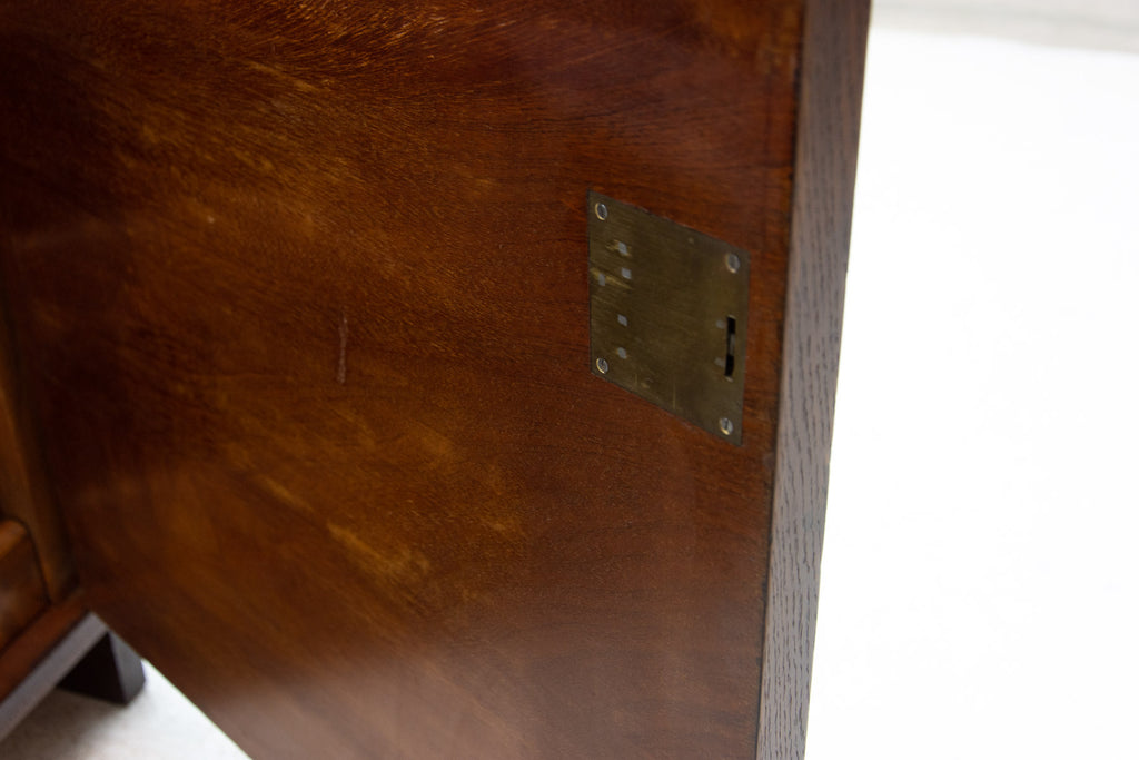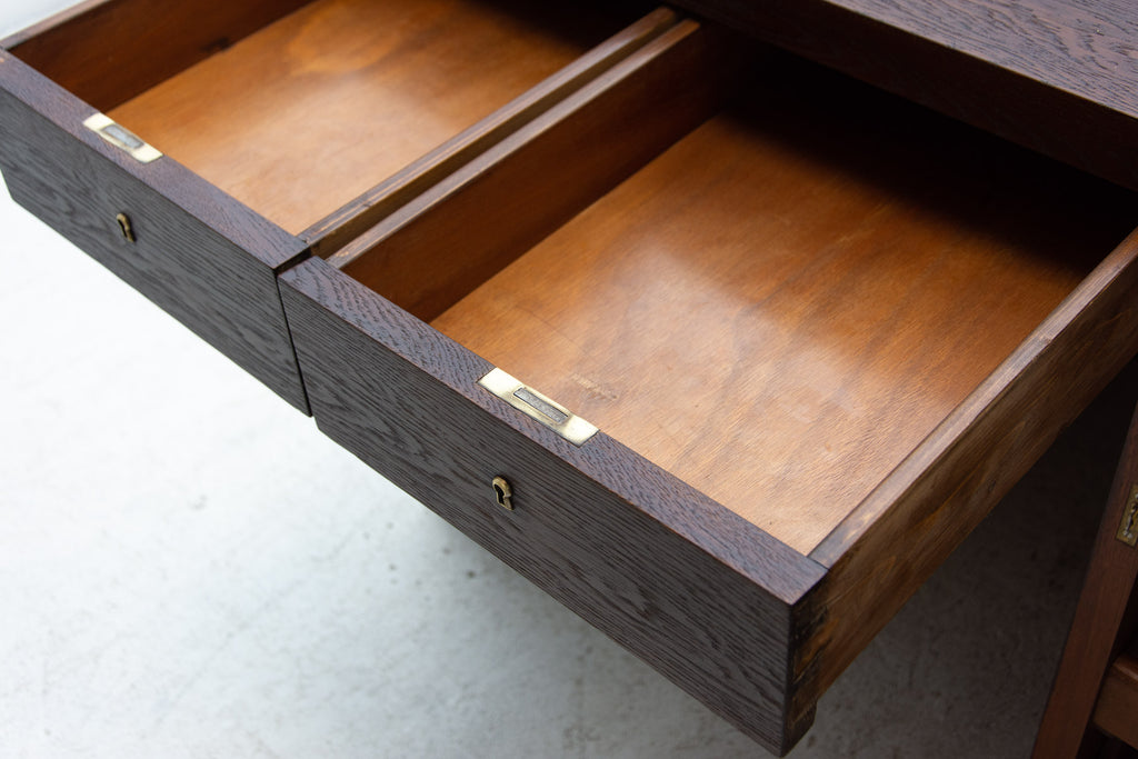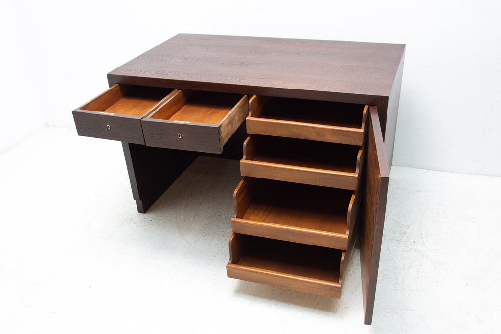 This massive functionalistic writing desk was made in the 1930s in Bohemia. It is veneered with oak veneer. Very interesting design typical for the functionalist period of the 1930s. The table is in very good condition, fully renovated.