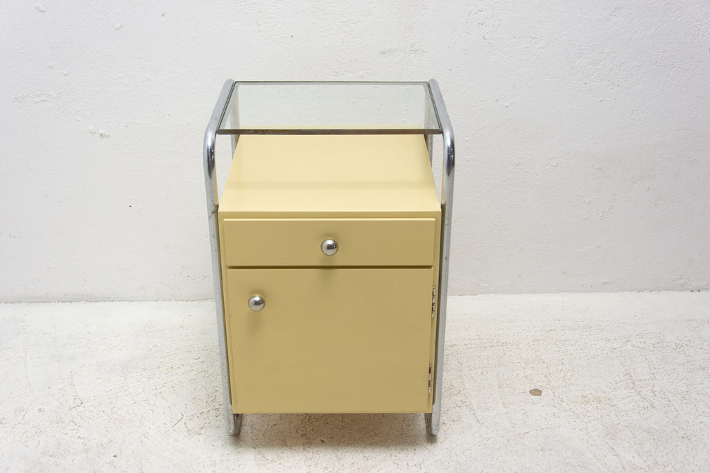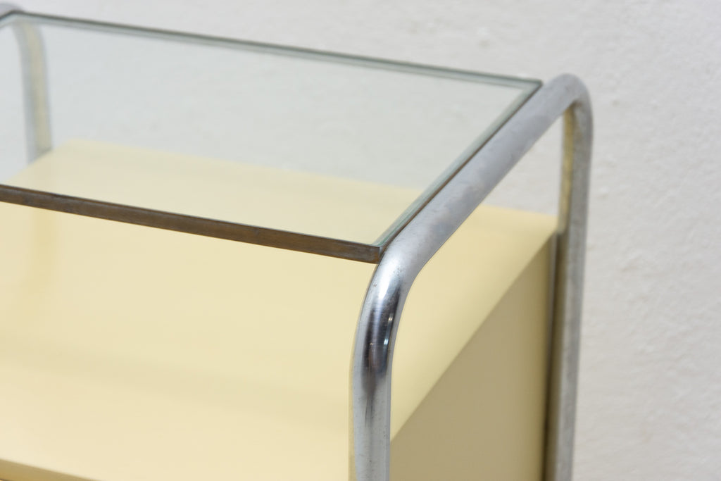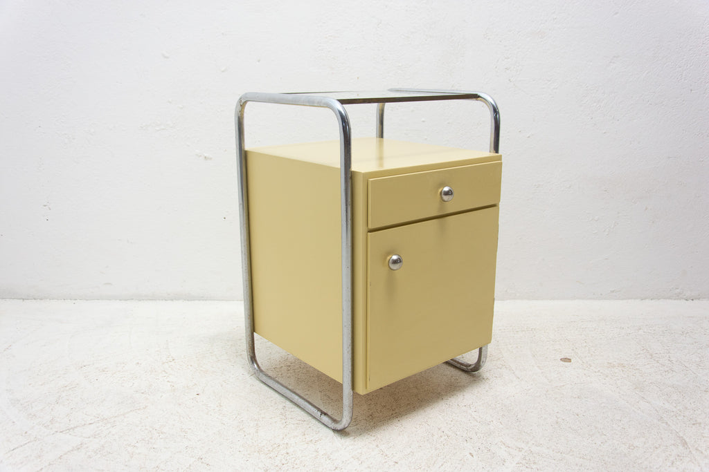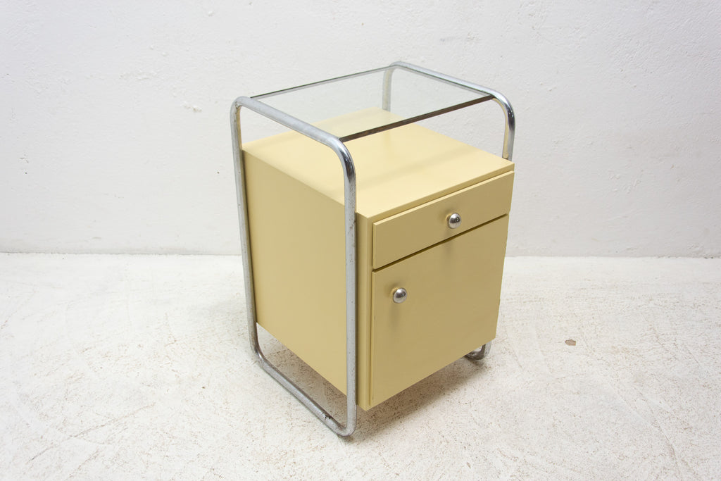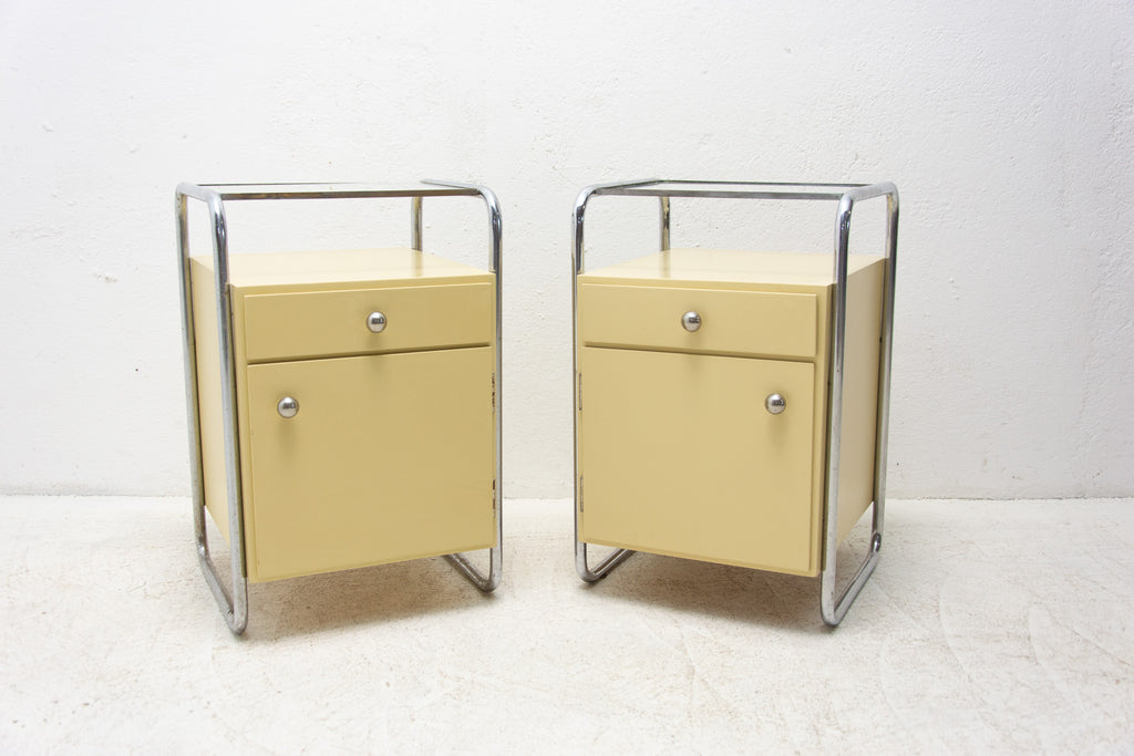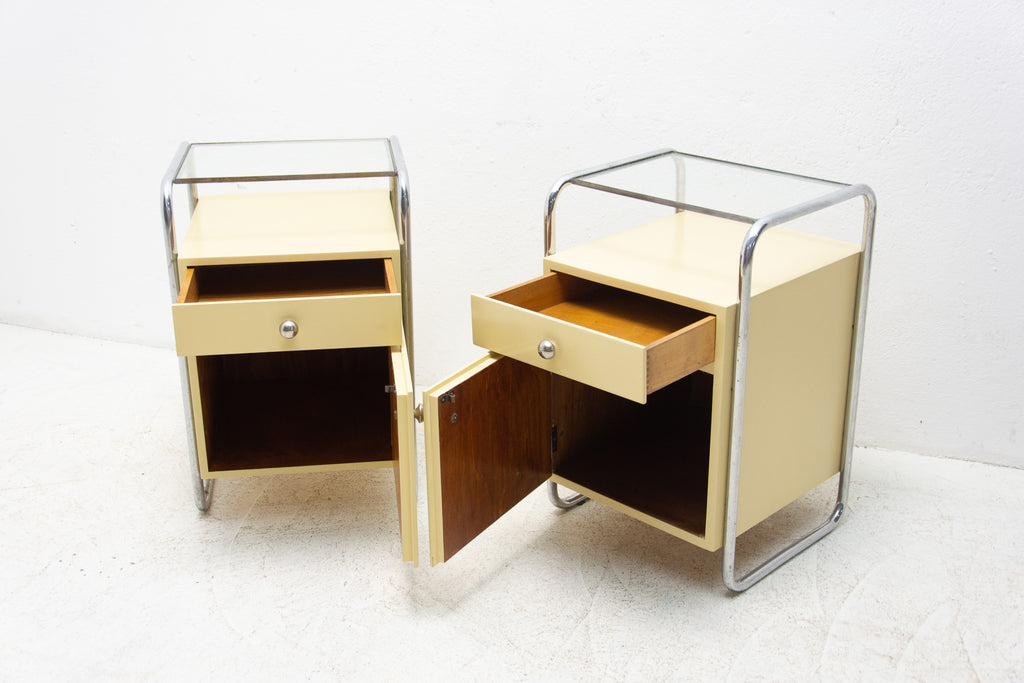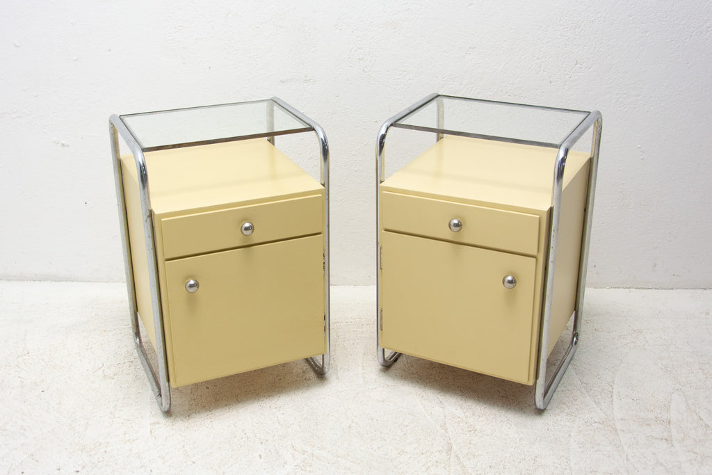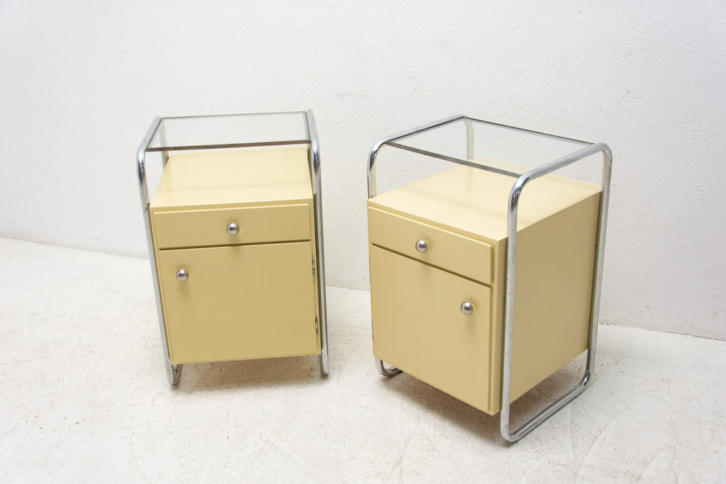 A pair of minimalist bedside tables(night stands) from the Bauhaus period. Outstanding timeless design. Made in the former Czechoslovakia in the 1930´s. A typical example of the Bauhaus period in Central Europe. It´s made of plywood and beechwood with chrome elements and glass on the top.