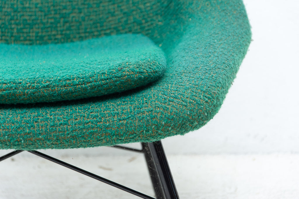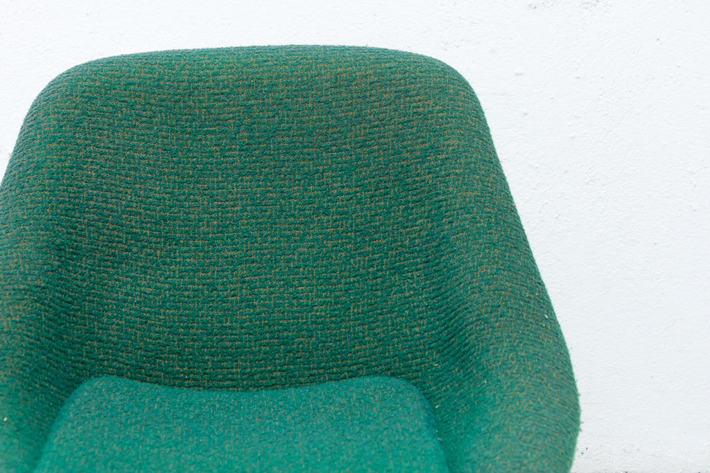 Is made of fiberglass and coated with a fabric that is elastically glued to this material. Characteristic are also metal legs, typical of the mid-20th century furniture design. The chair is structurally in good original condition, but the fabric shows signs of wear and age.