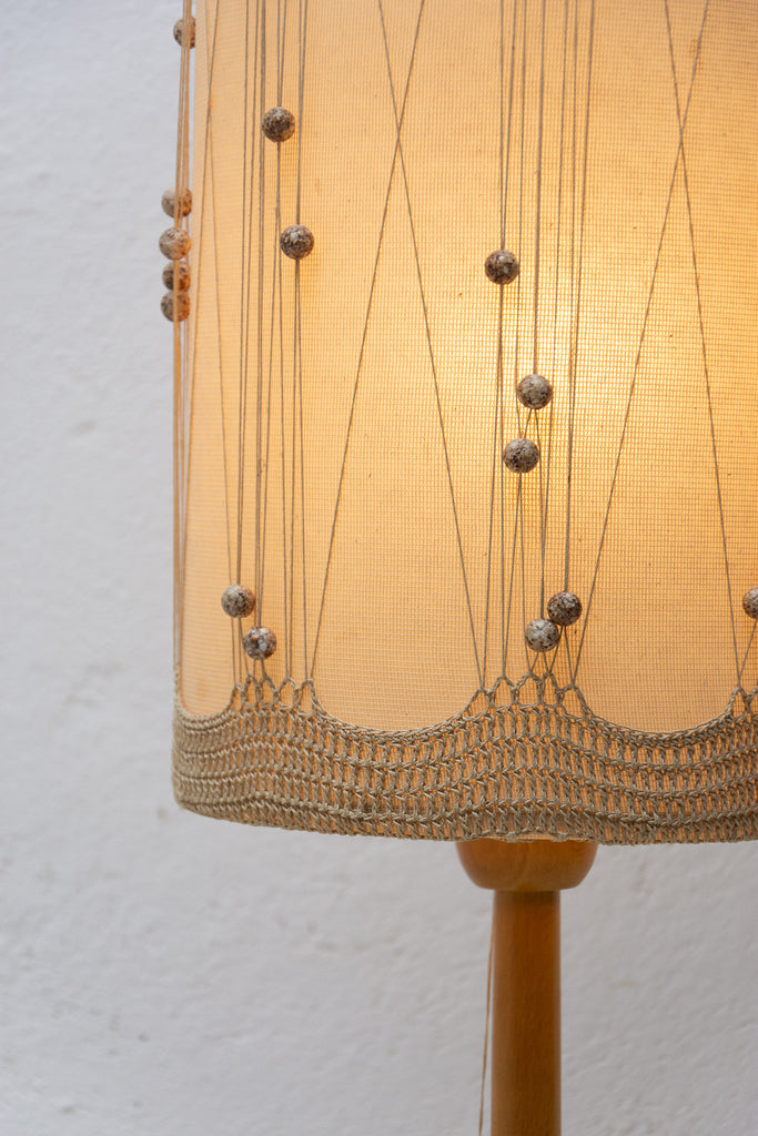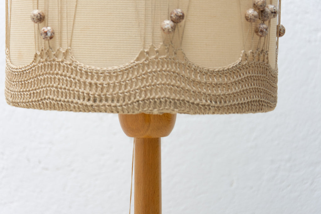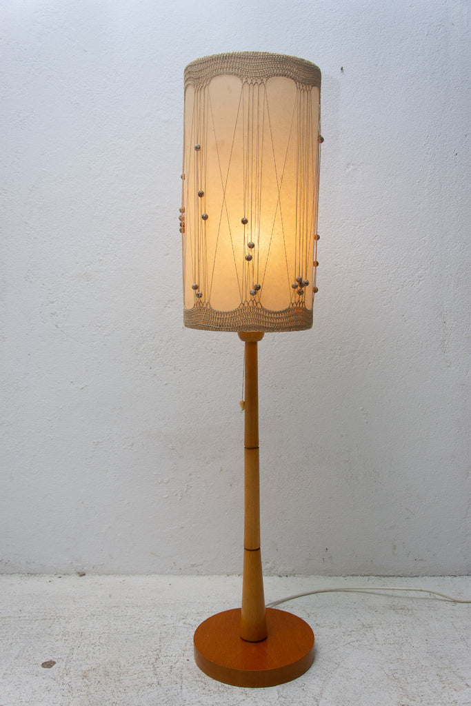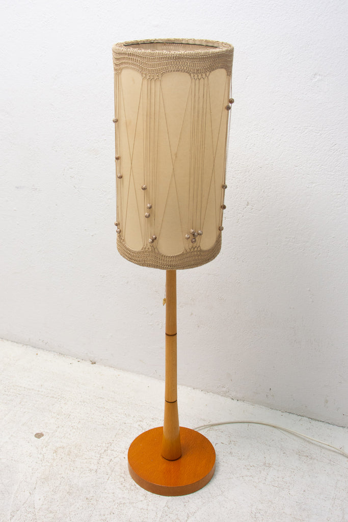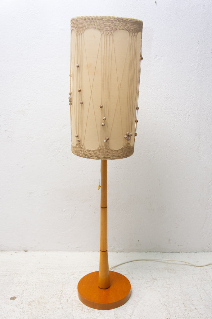 Vintage wooden floor lamp made of beech with fabric lampshade.