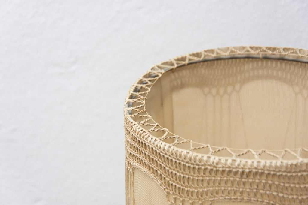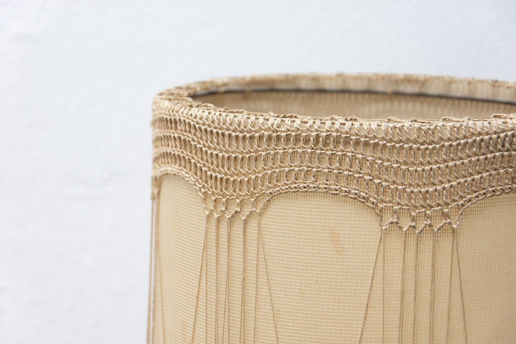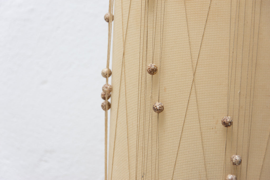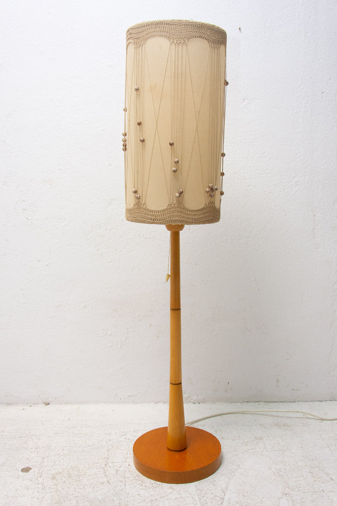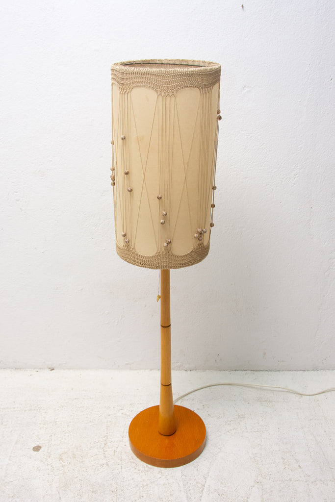 Vintage wooden floor lamp made of beech with fabric lampshade.