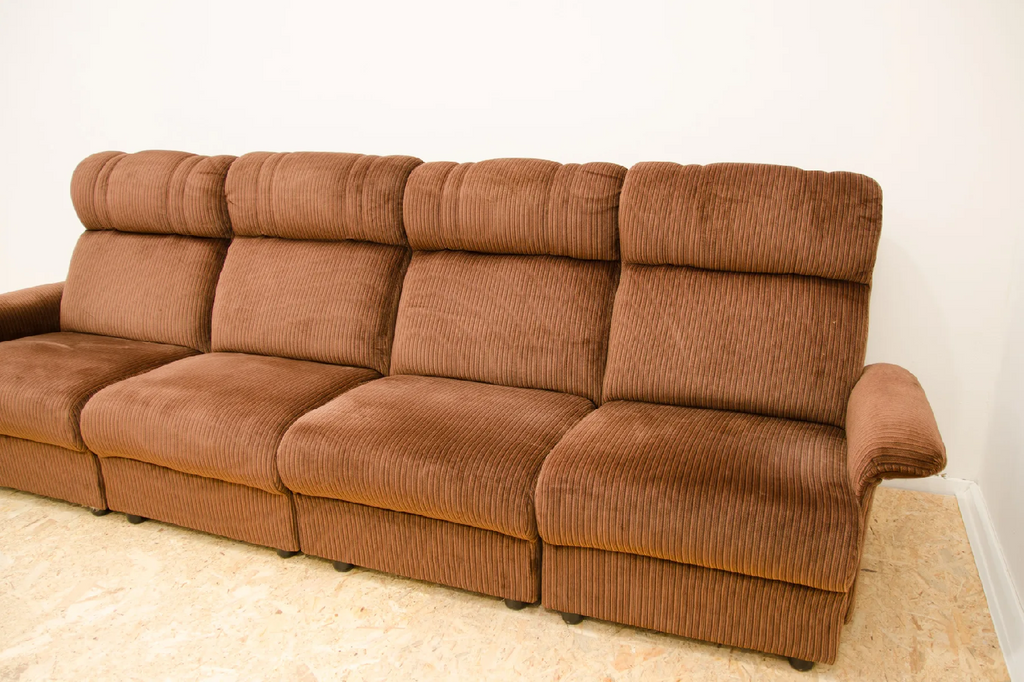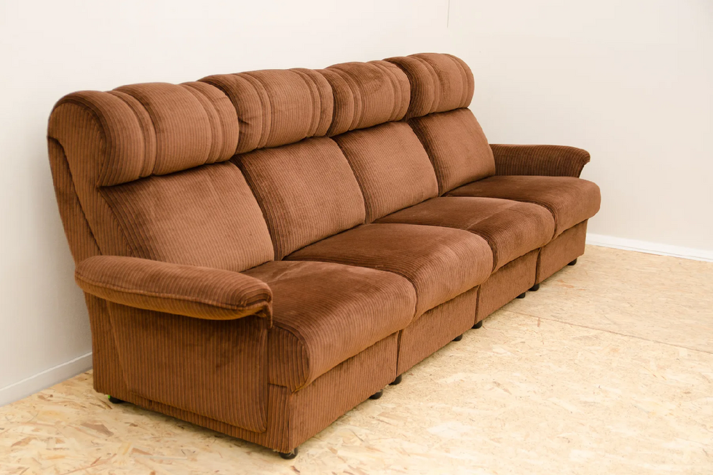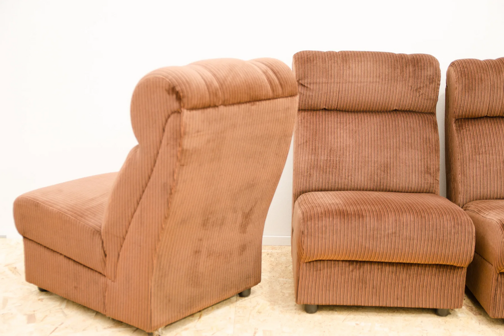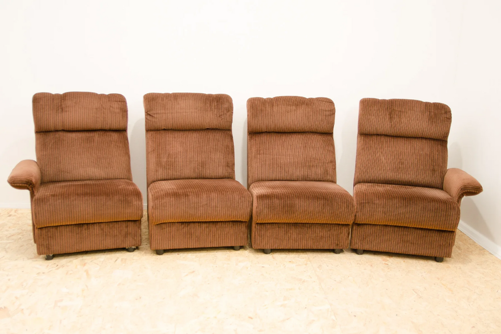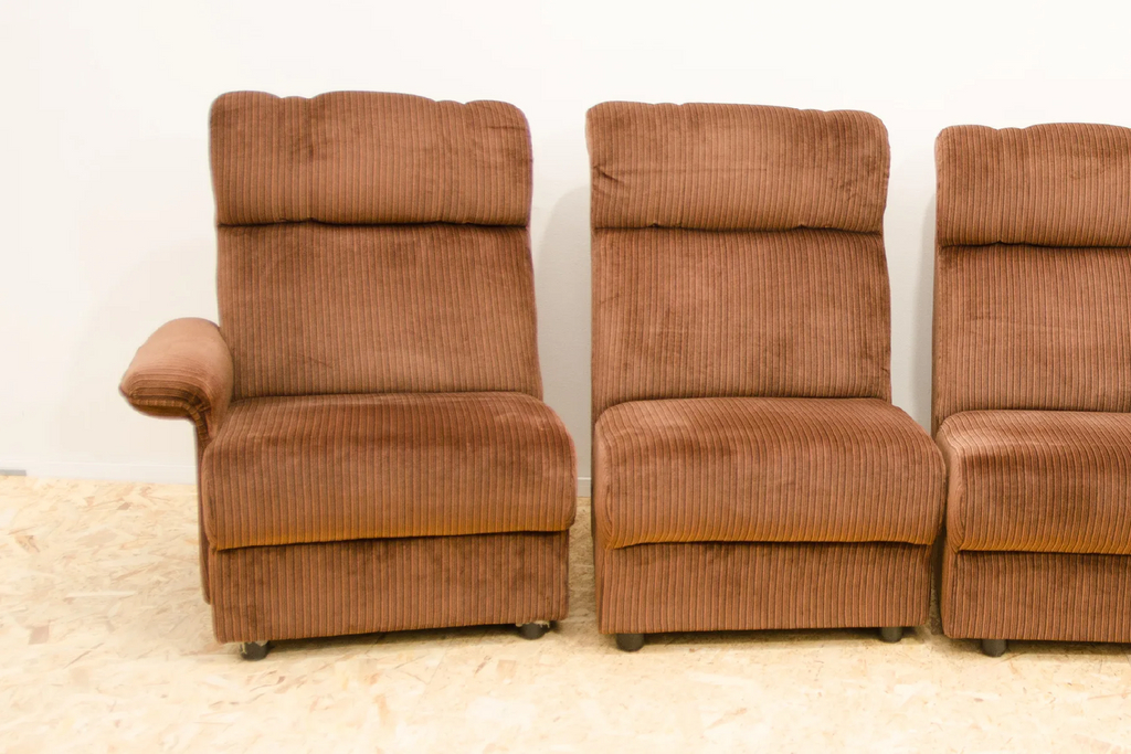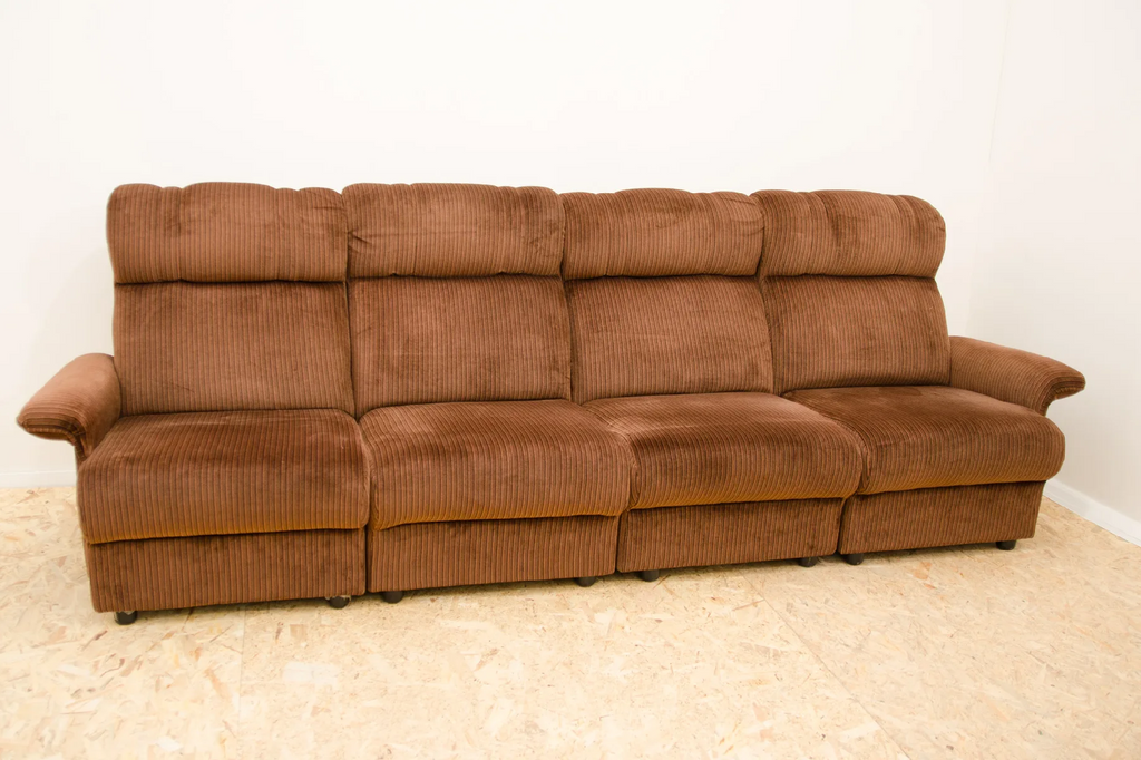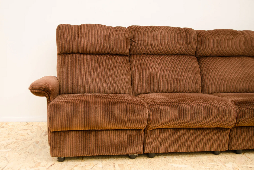 This modular sofa was made in the 80s in Central Europe, probably in Germany. It can be divided into 4 free-standing armchairs on wheels. It is made of plywood, foam, wood and upholstery, upholstered with corduroy fabric. It is in excellent condition, with minor signs of age and use. The sofa is very comfortable.