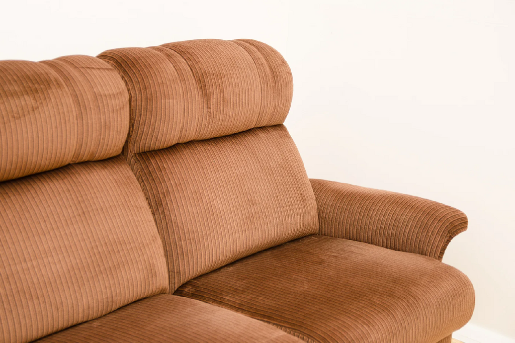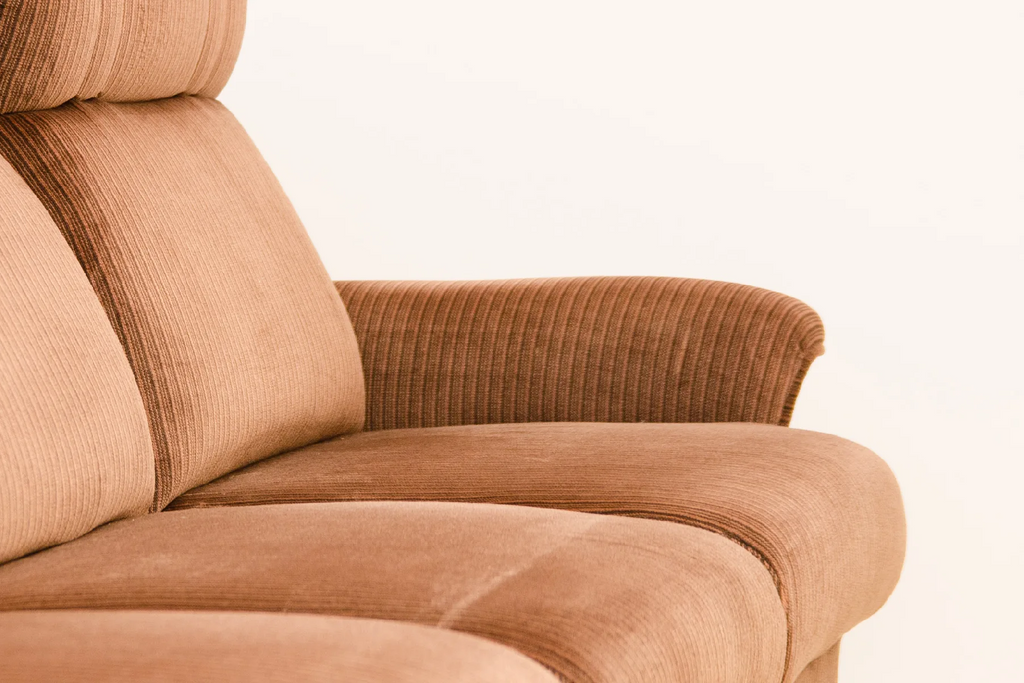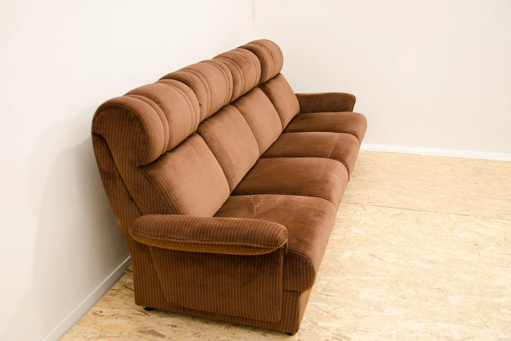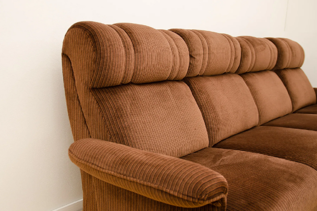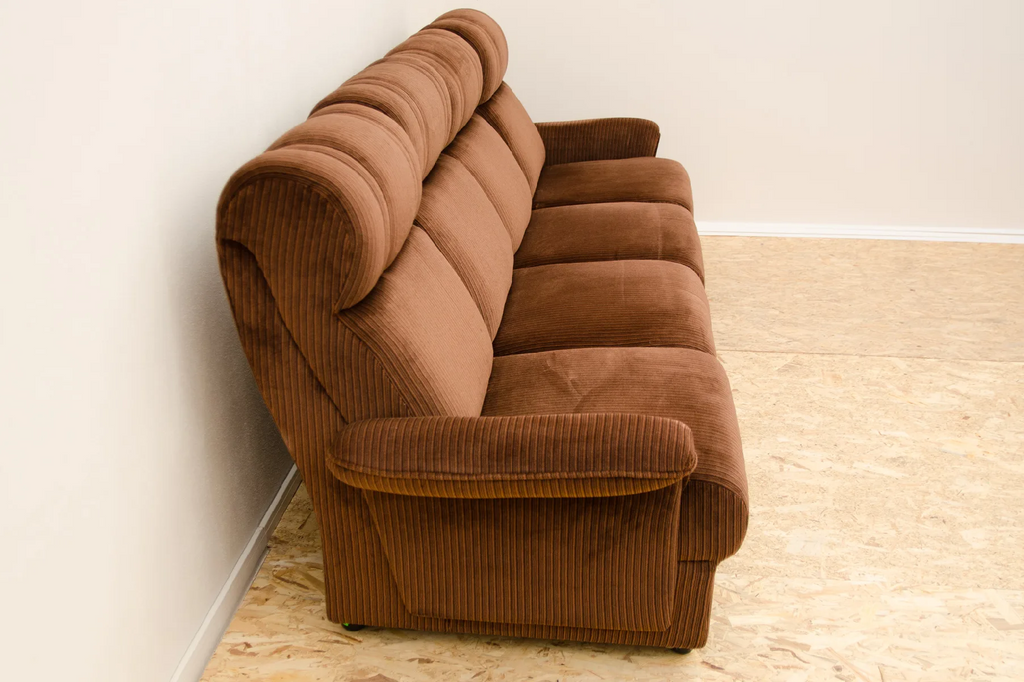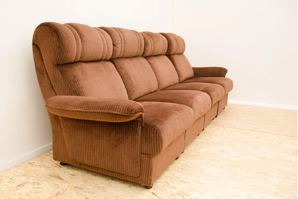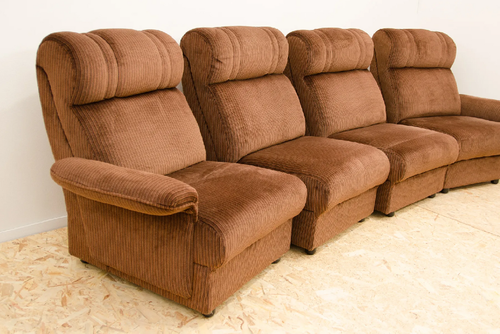 This modular sofa was made in the 80s in Central Europe, probably in Germany. It can be divided into 4 free-standing armchairs on wheels. It is made of plywood, foam, wood and upholstery, upholstered with corduroy fabric. It is in excellent condition, with minor signs of age and use. The sofa is very comfortable.
