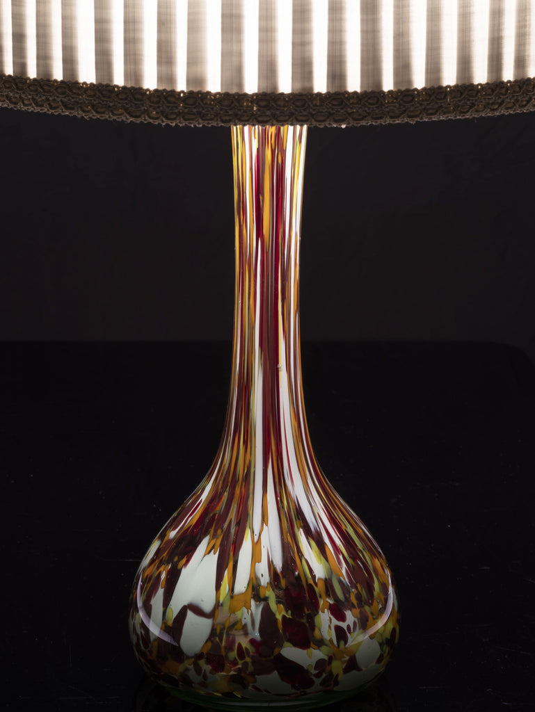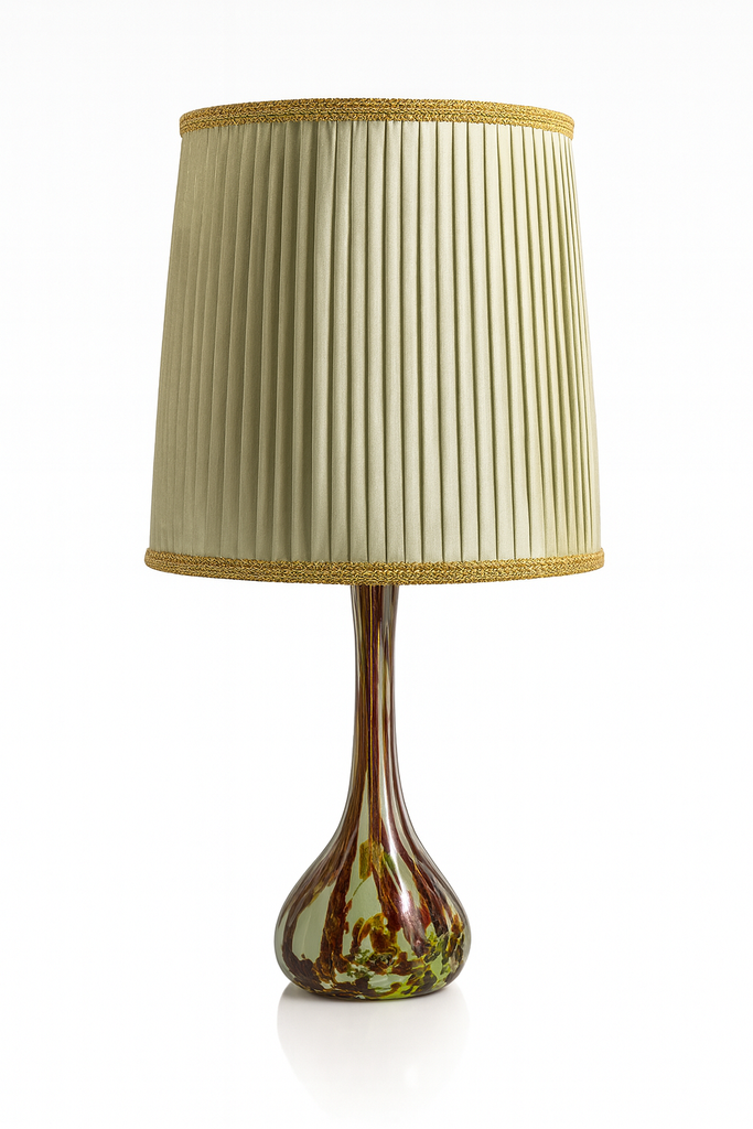 This vintage table lamp from the 1960s–1970s features a multicolored hand-blown glass base paired with a warm-toned textile lampshade. The glass base shows softly blended hues characteristic of mid-century decorative lighting, while the shade presents a refined combination of light beige and muted olive, adding a natural and understated elegance to the piece. Its tall profile gives it a strong visual presence, making it suitable as an accent in living rooms, bedrooms, or reading spaces.
