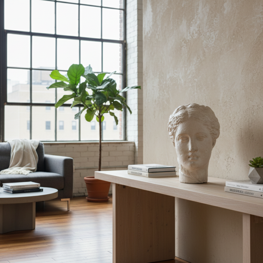Modeled in gypsum plaster with finely balanced proportions and delicate facial expression, the piece shows excellent surface preservation. The off-white tone has developed a light beige patina, enhancing its depth and historical character.